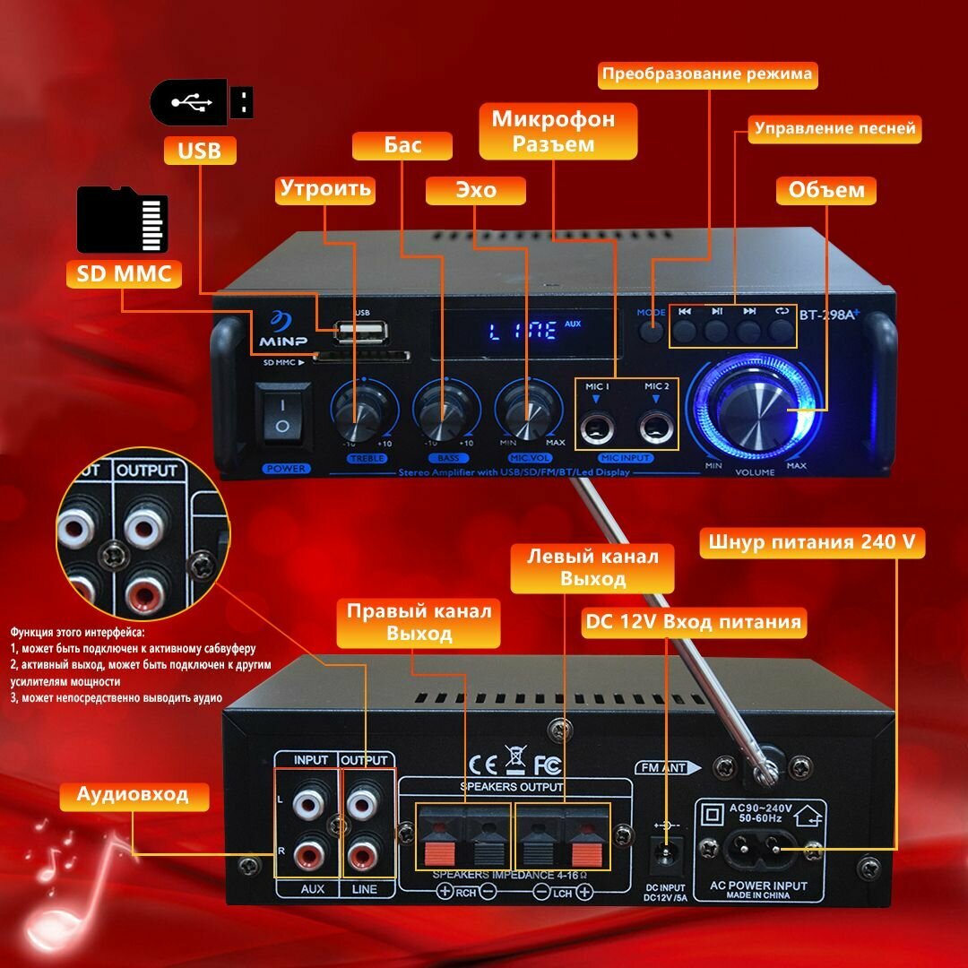 СохранитьУсилитель звука для колонок, усилитель для колонок298A+ HiFI с Bluetooth 5.3, FM, 50 Вт+50 Вт поддержка активного сабвуфера интересное: