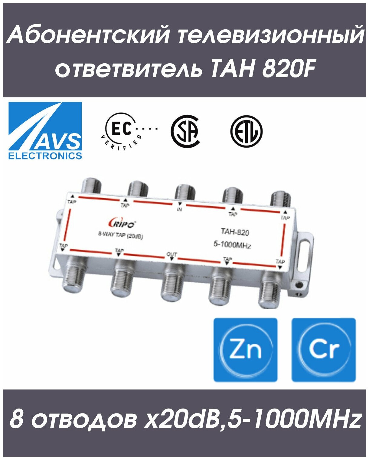 Купить Направленный абонентский TAH ответвитель телевизионный ТАН 820F (8х20dB,5-1000МНz) RIPO 005-400152