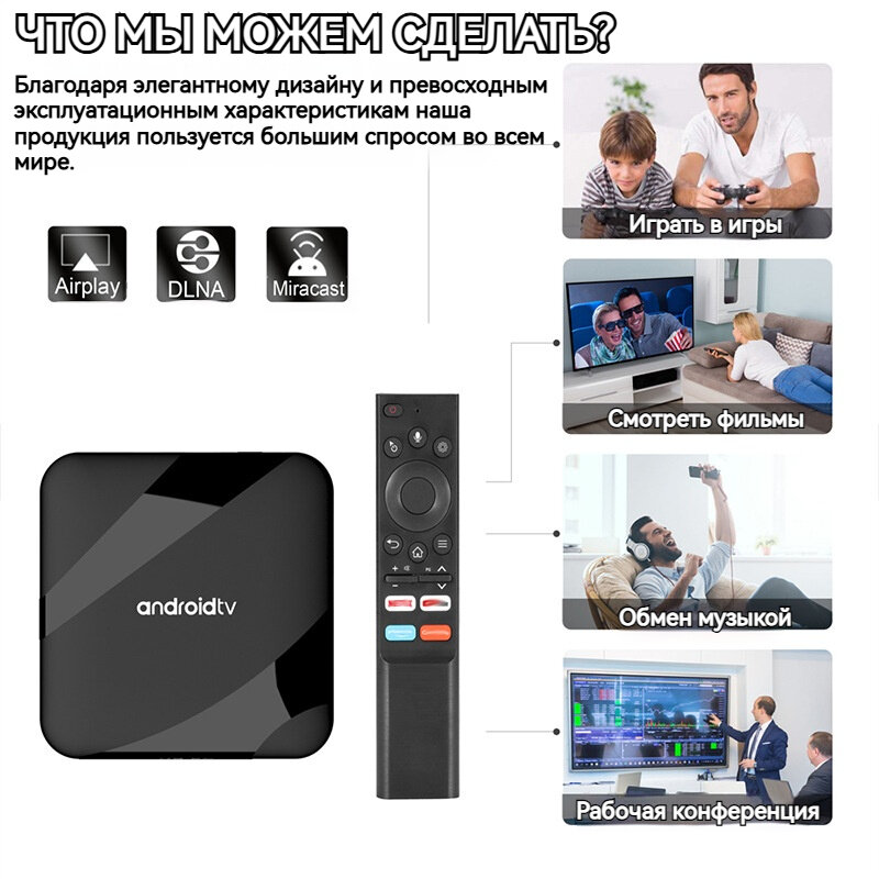 Смарт ТВ приставка 4ГБ/64ГБ, Android 14, высокое разрешение 3840x2160, Google Assistant, WiFi 2,4G/5G для дома и семьи интересное: