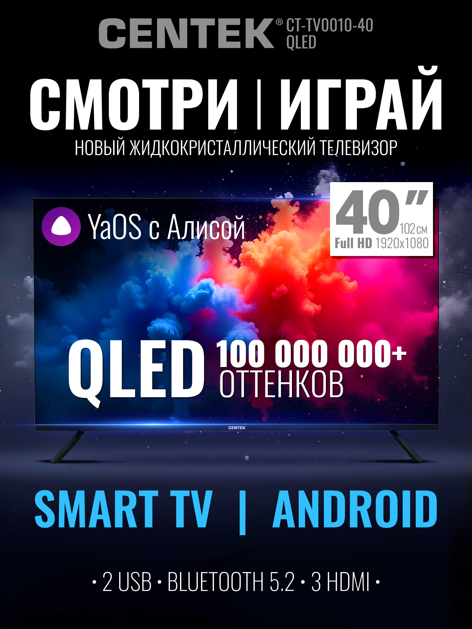 Купить Телевизор 40 дюймов CENTEK CT-TV0010-40 QLED экран/ Full HD/ SMART YaOS/ Алиса/ Wi-Fi/ Bluetooth/ черный