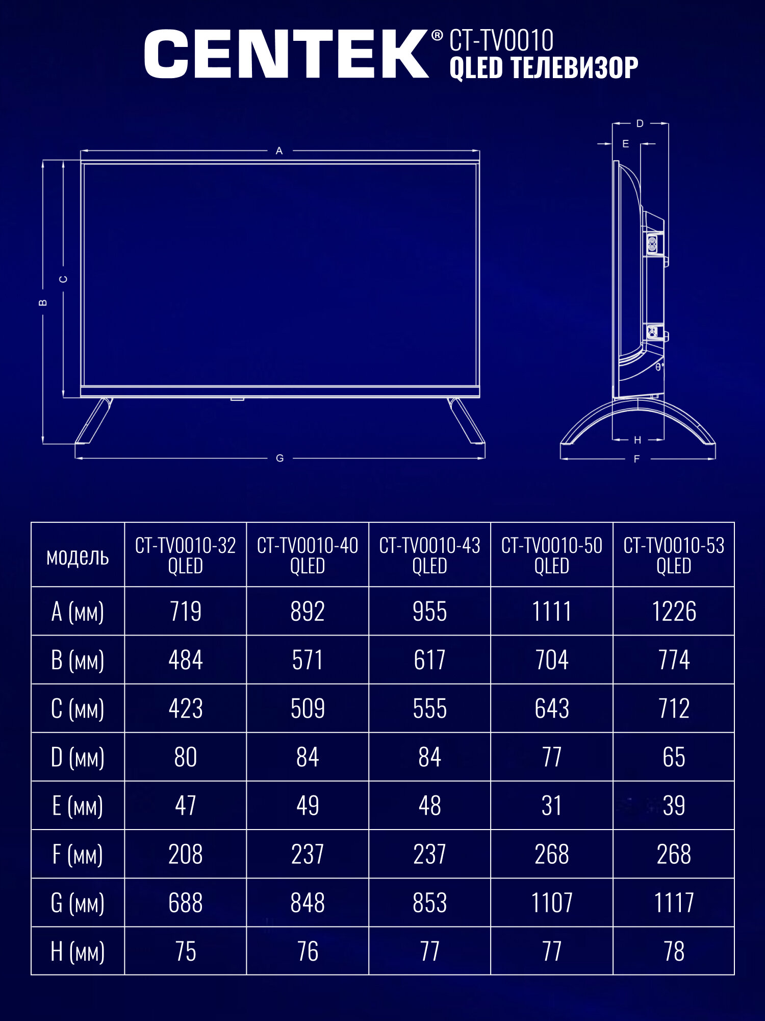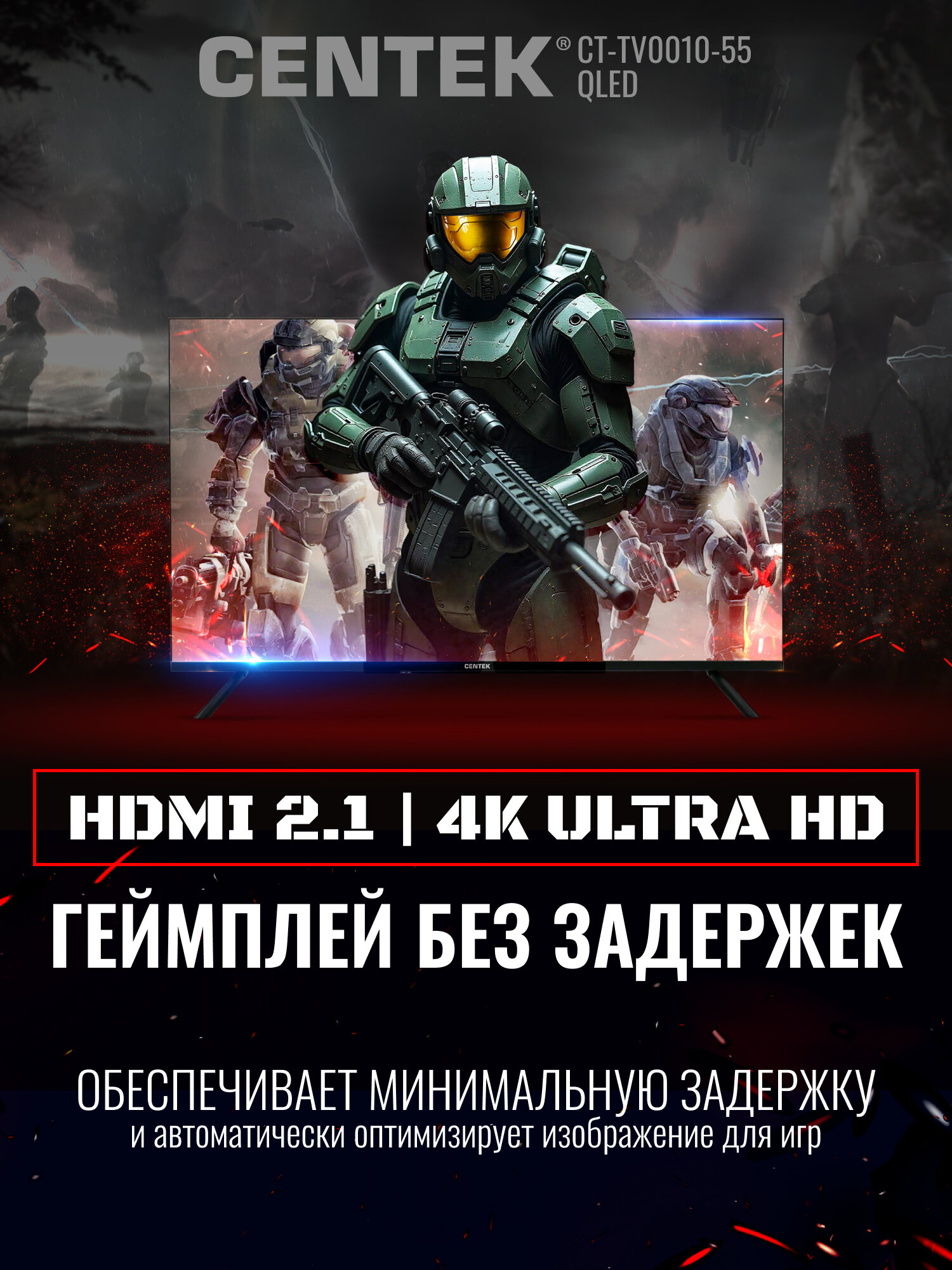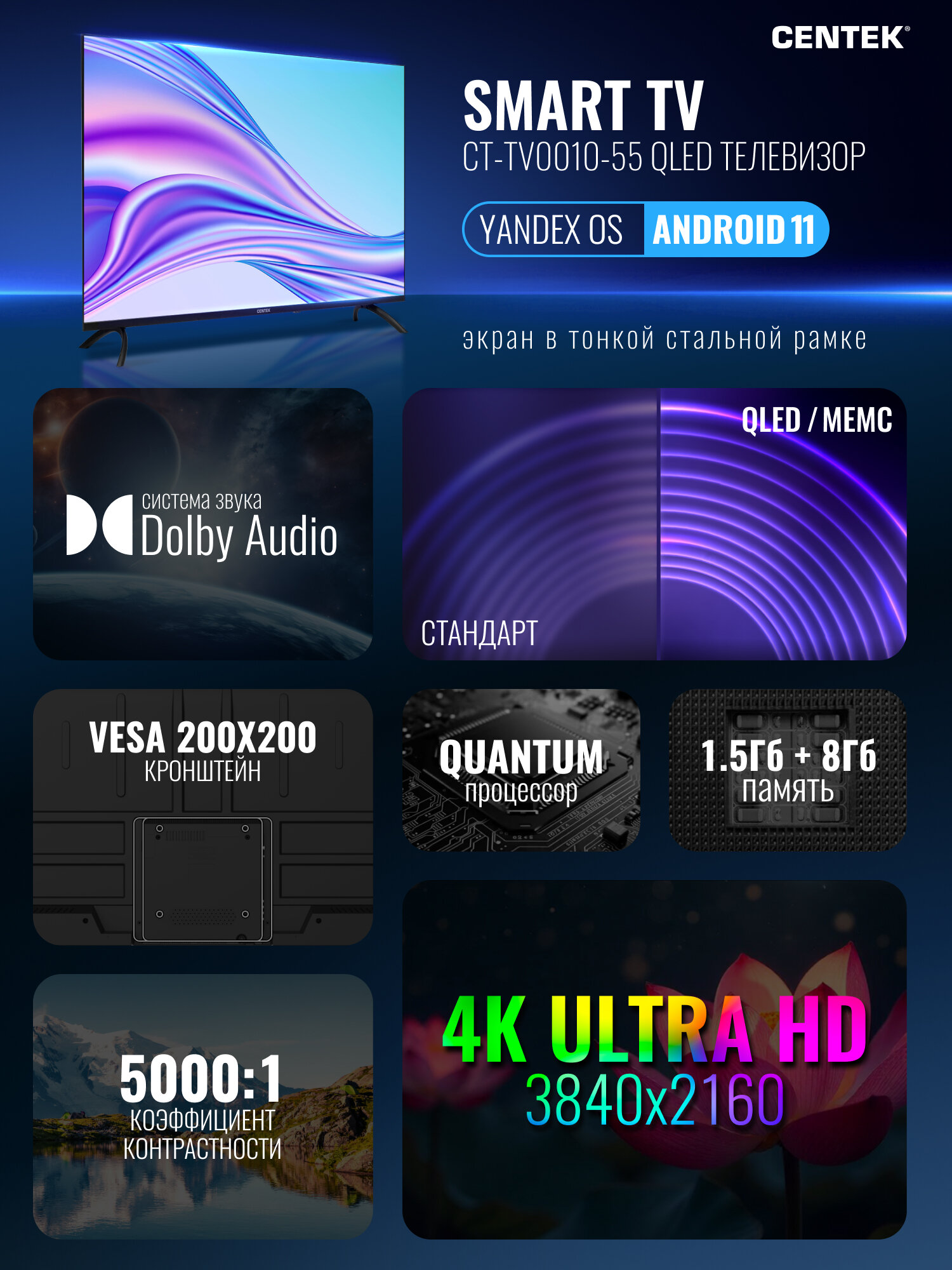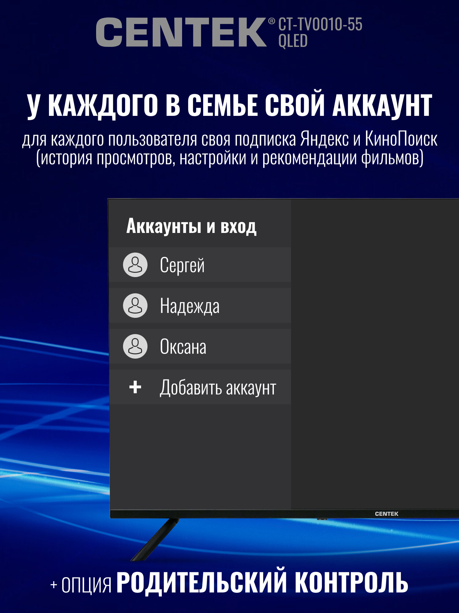 Телевизор 55 дюймов CENTEK CT-TV0010-55: QLED экран/ 4K/ SMART YaOS/ Алиса/ Wi-Fi/ Bluetooth/ черный интересное: