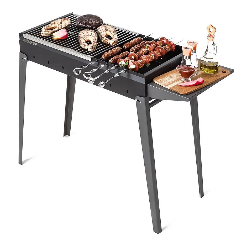 | Плюсы: | Есть столик для готовки или чтобы принадлежности положить. Подходит для большой компании. Можно комбинировать мясо на шампурах и стейки на решётке. |