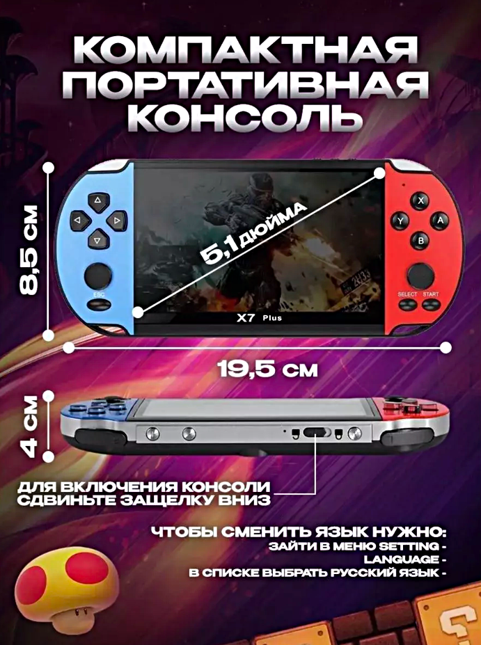 Игровая приставка X7 PLUS, Портативная игровая консоль с 5.1 дюймовым экраном, 1000+ игр, Память 8 гб, Цветной интересное: