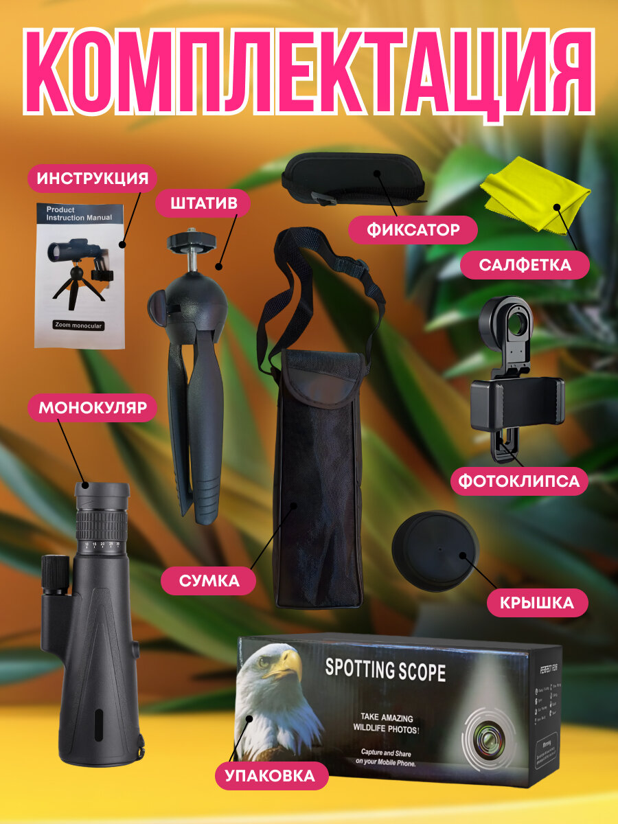 Ниже Вы можете прочитать отзывы на Монокуляр мощный с большой кратностью и зумом 30x с креплением для телефона и штативом, ознакомится с подробными характеристиками, посмотреть интересные обзоры и фотографии на Монокуляр мощный с большой кратностью и зумом 30x с креплением для телефона и штативом.
