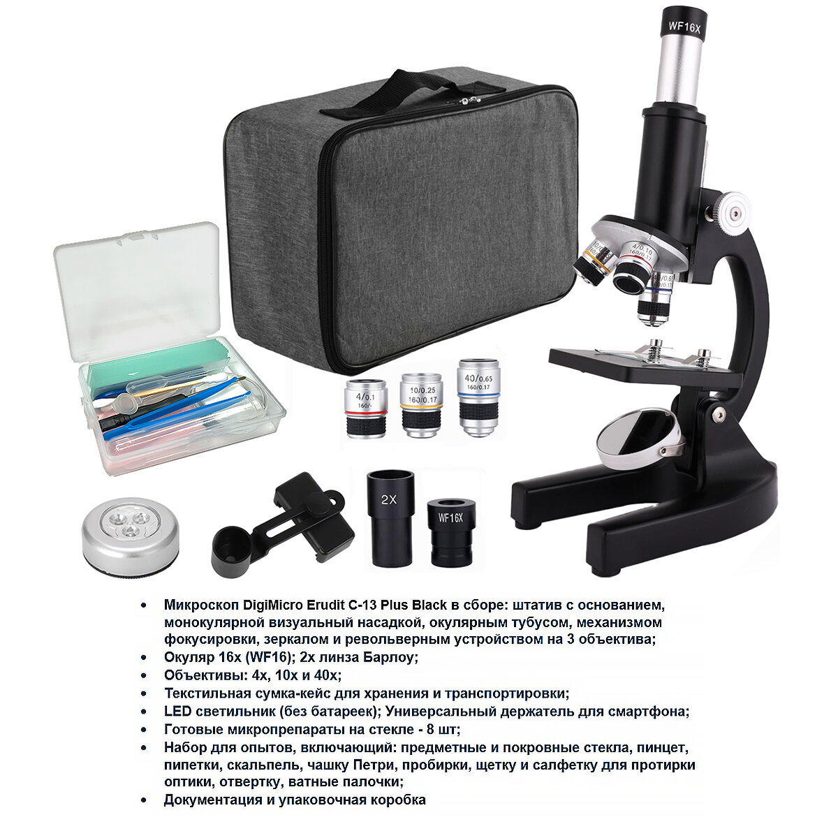 Купить Учебный школьный биологический микроскоп DigiMicro Erudit С-13 Plus Black с препаратами в кейсе