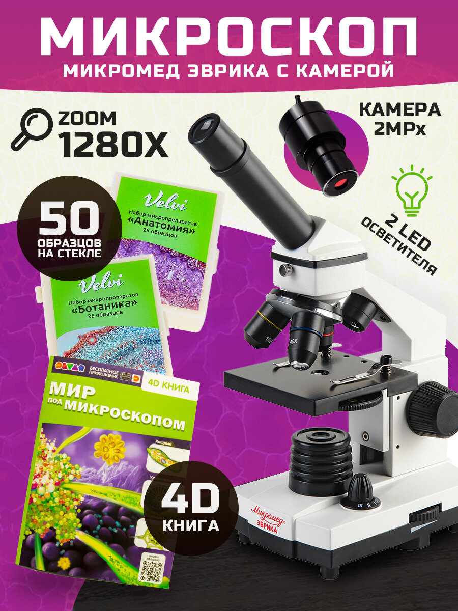 Микроскоп Микромед "Эврика" 40x-1280x, с видеоокуляром, в кейсе, 4D книгой и препаратами Ботаника, Анатомия интересное: