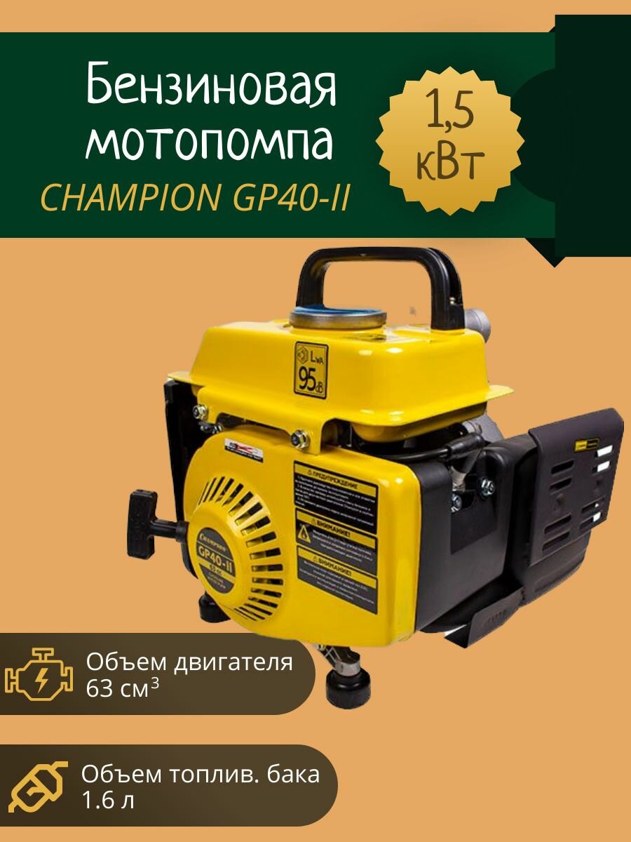Мотопомпа GP40-II CHAMPION (1.5кВт 2х/тактн. чистая вода 250л/мин 20/6м 40мм 15кг)