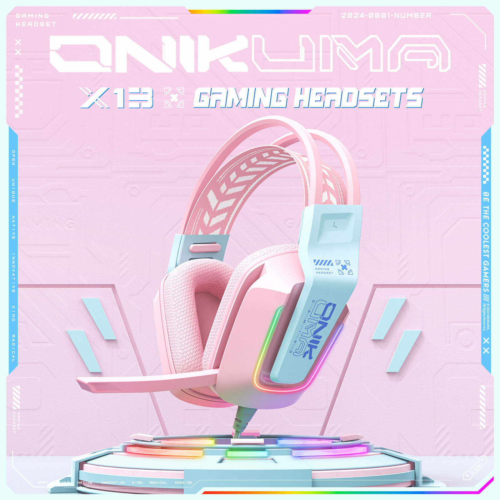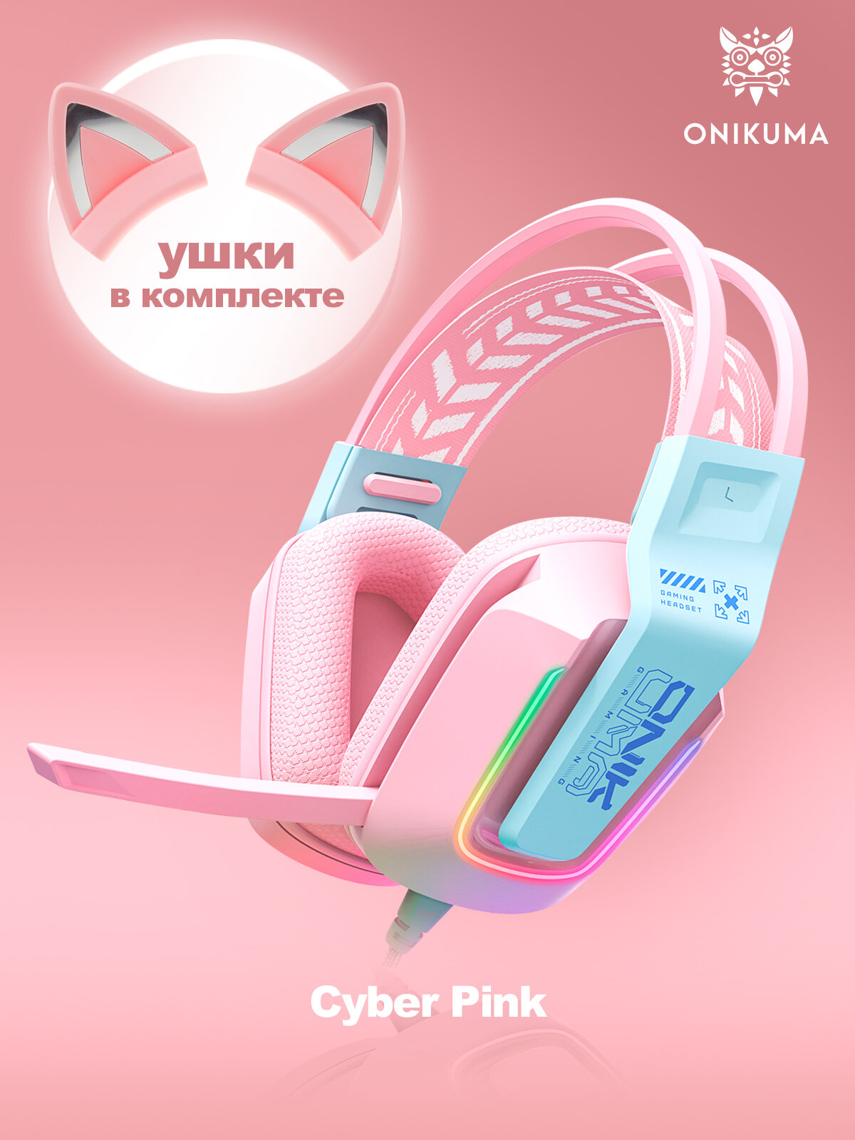 Купить Игровые наушники Onikuma X13-P-CE Cyber Pink розовые с RGB подсветкой / с декоративными кошачьими ушками