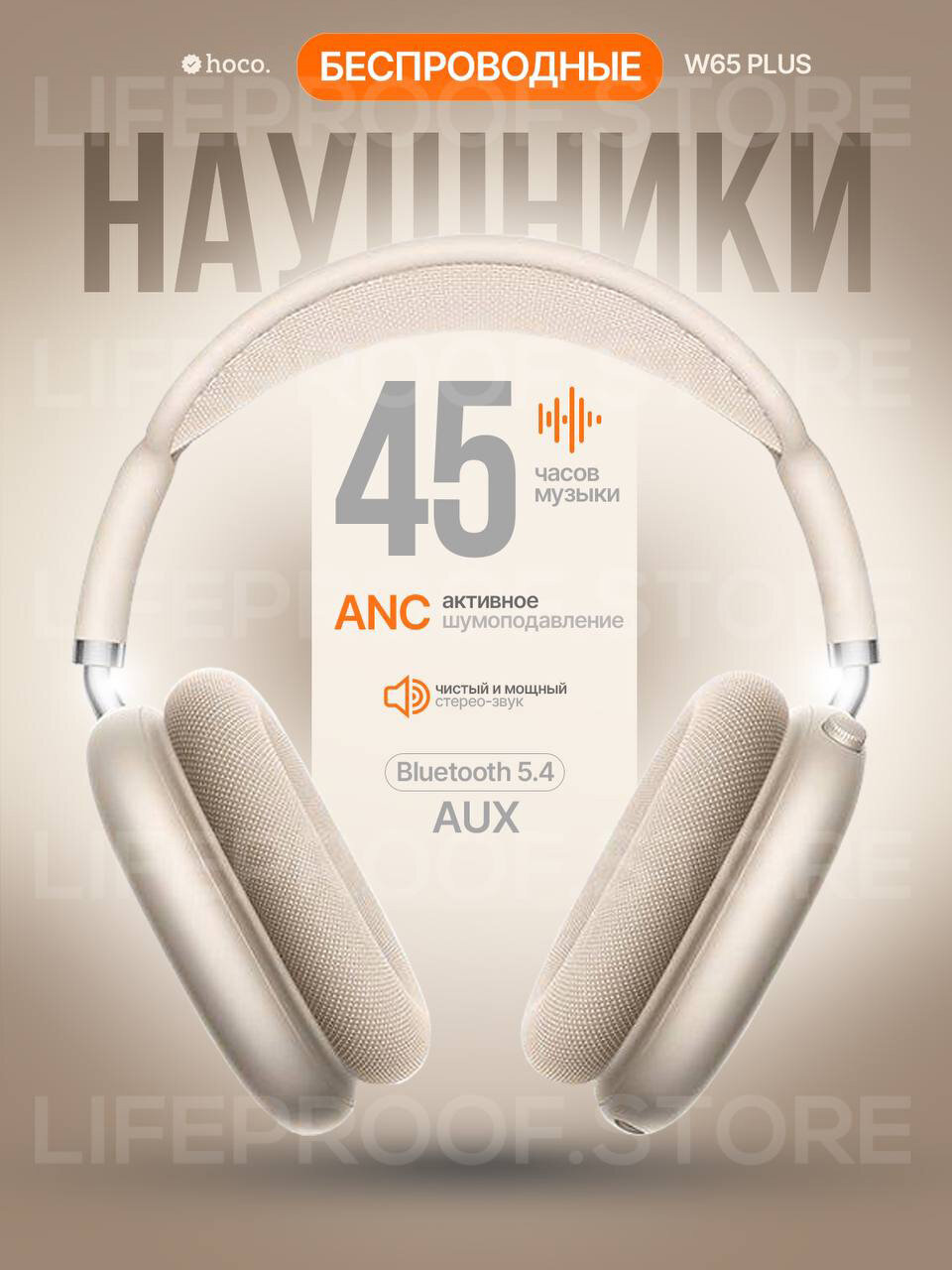 Беспроводные полноразмерные наушники Hoco W65 с аккумулятором на 45 часов, BT 5.4, цвет Бежевый