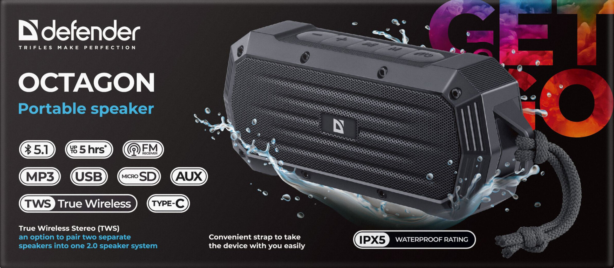 Мощная портативная колонка Defender Octagon, 5 Вт, Bluetooth, FM, microSD, USB, черный интересное:
