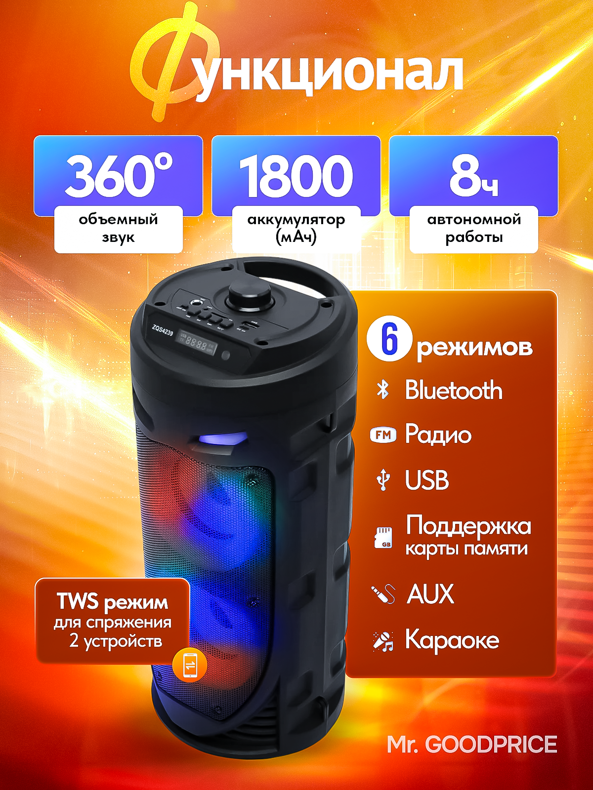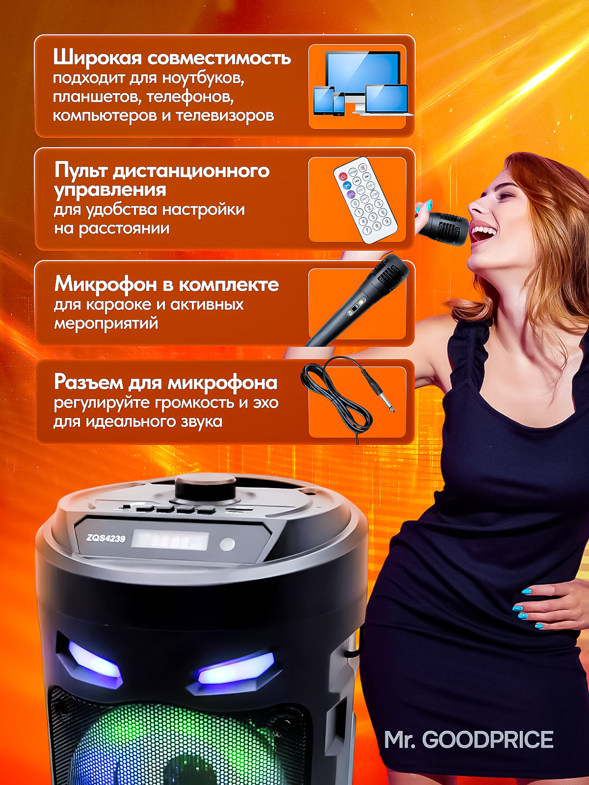 Портативная колонка bluetooth zqs 4239 с пультом ДУ и микрофоном
