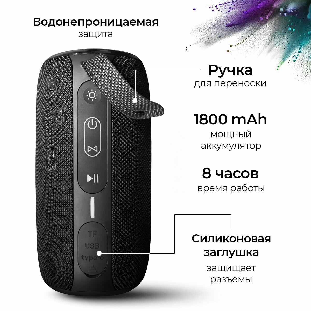 Портативная колонка TFN Quadro, 3Вт, Bluetooth 5.0, microSD, microUSB, IPX6, 1500мАч, черная