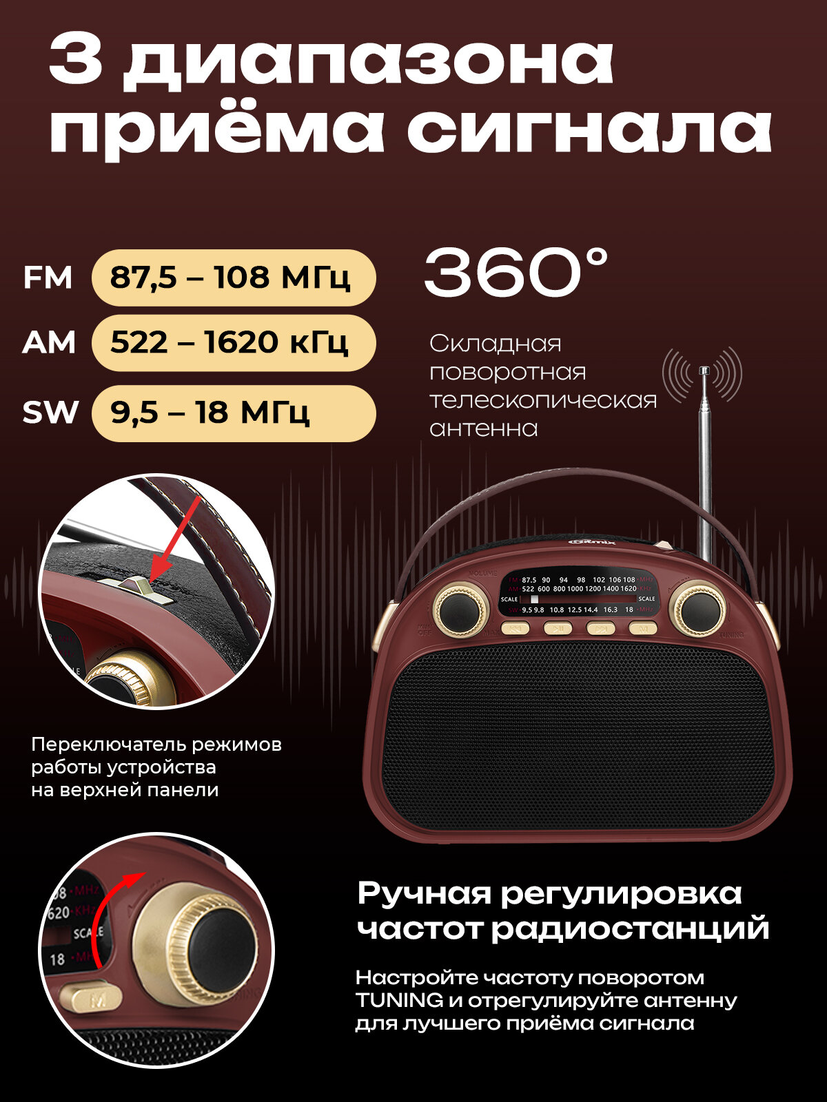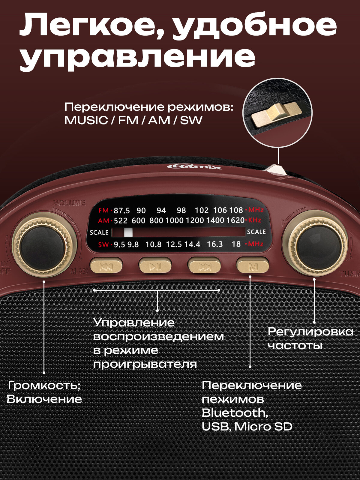 Радиоприемник RITMIX RPR-040 CHOCOLATE портативный, Bluetooth, USB/micro SD интересное: