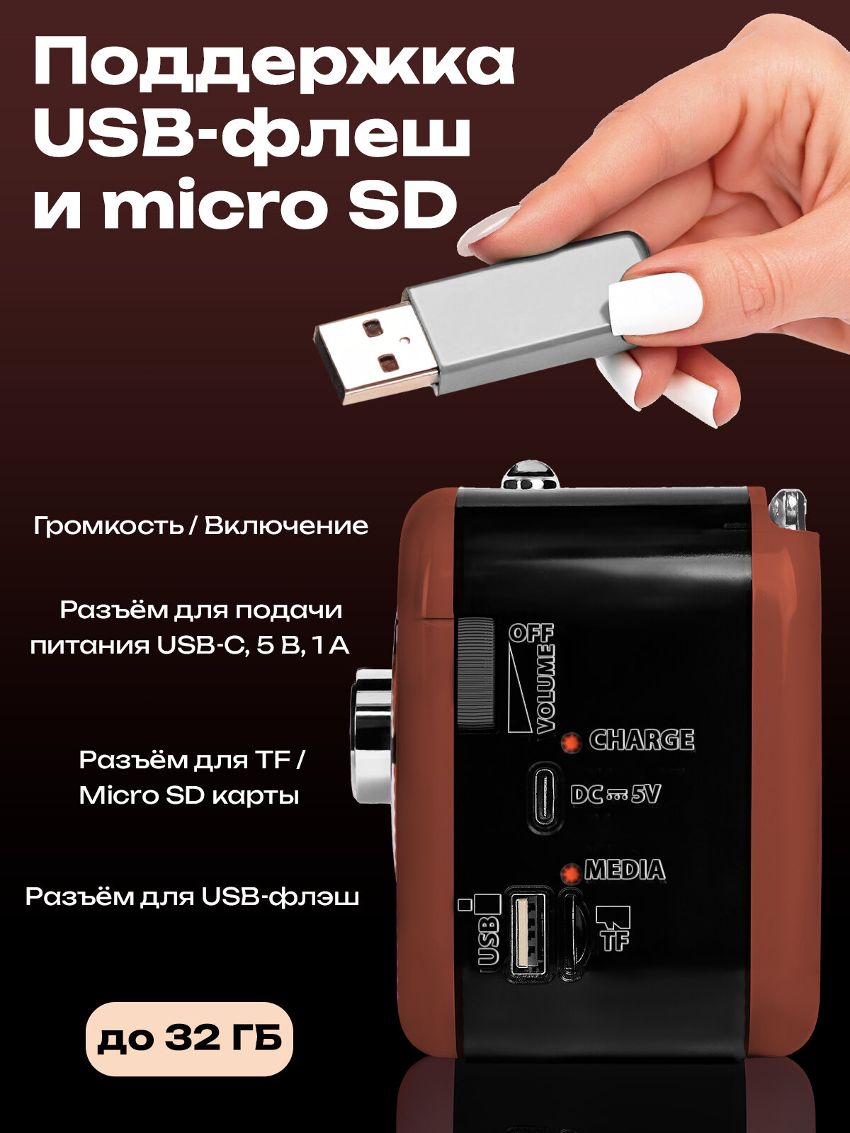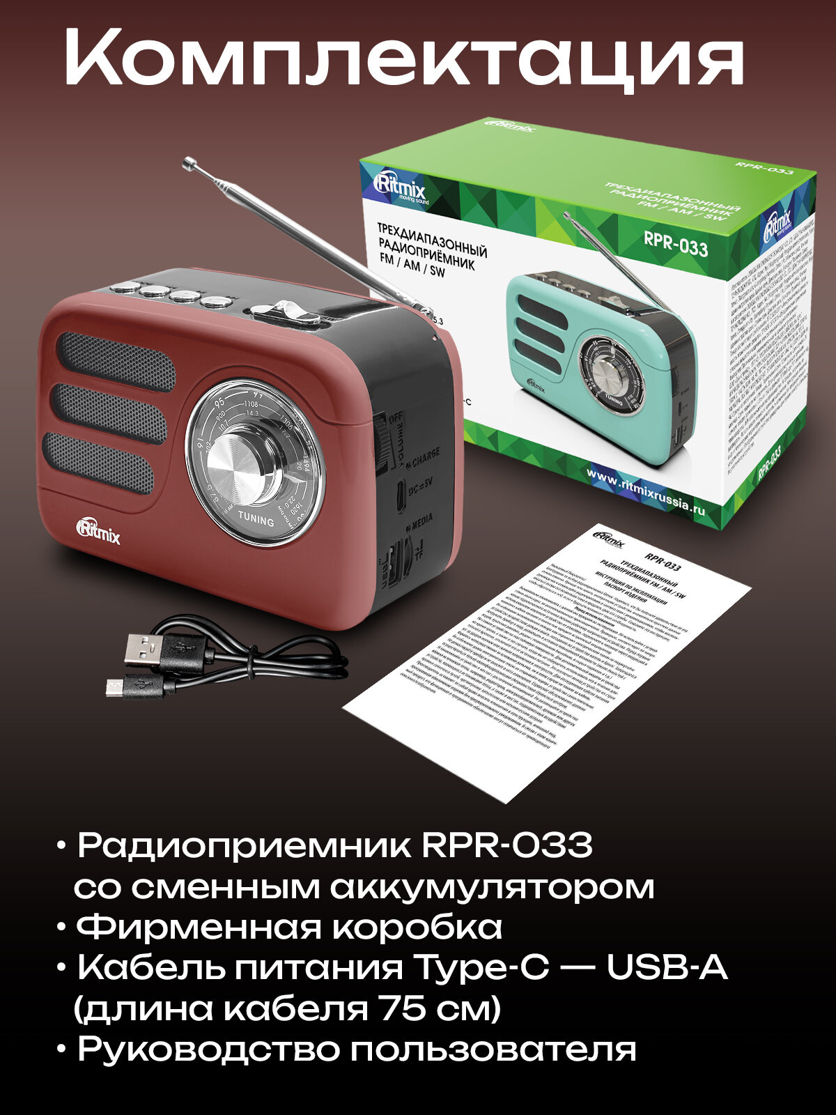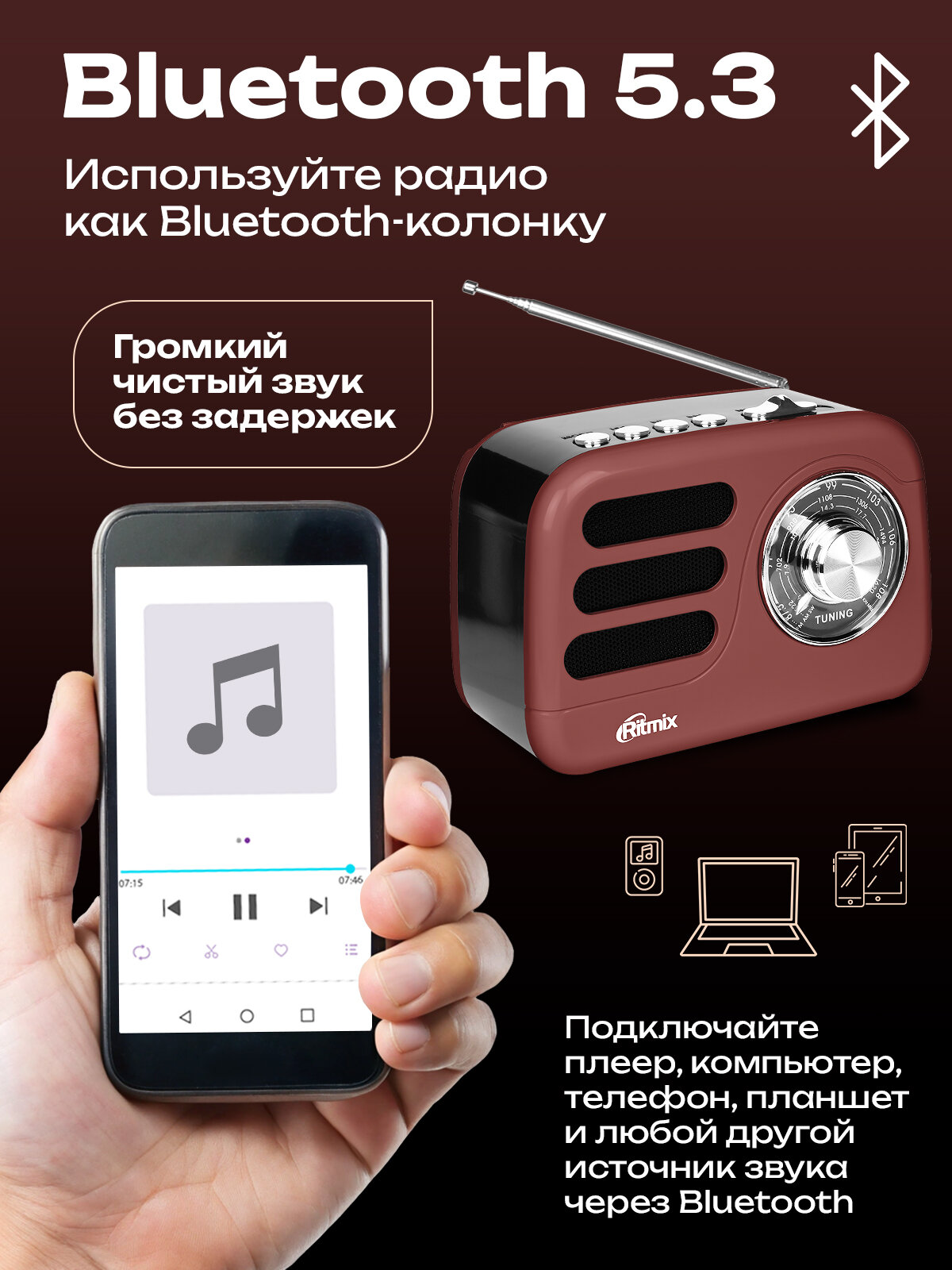 Радиоприемник RITMIX RPR-033 CHOCOLATE Bluetooth 5.3, USB/micro SD интересное: