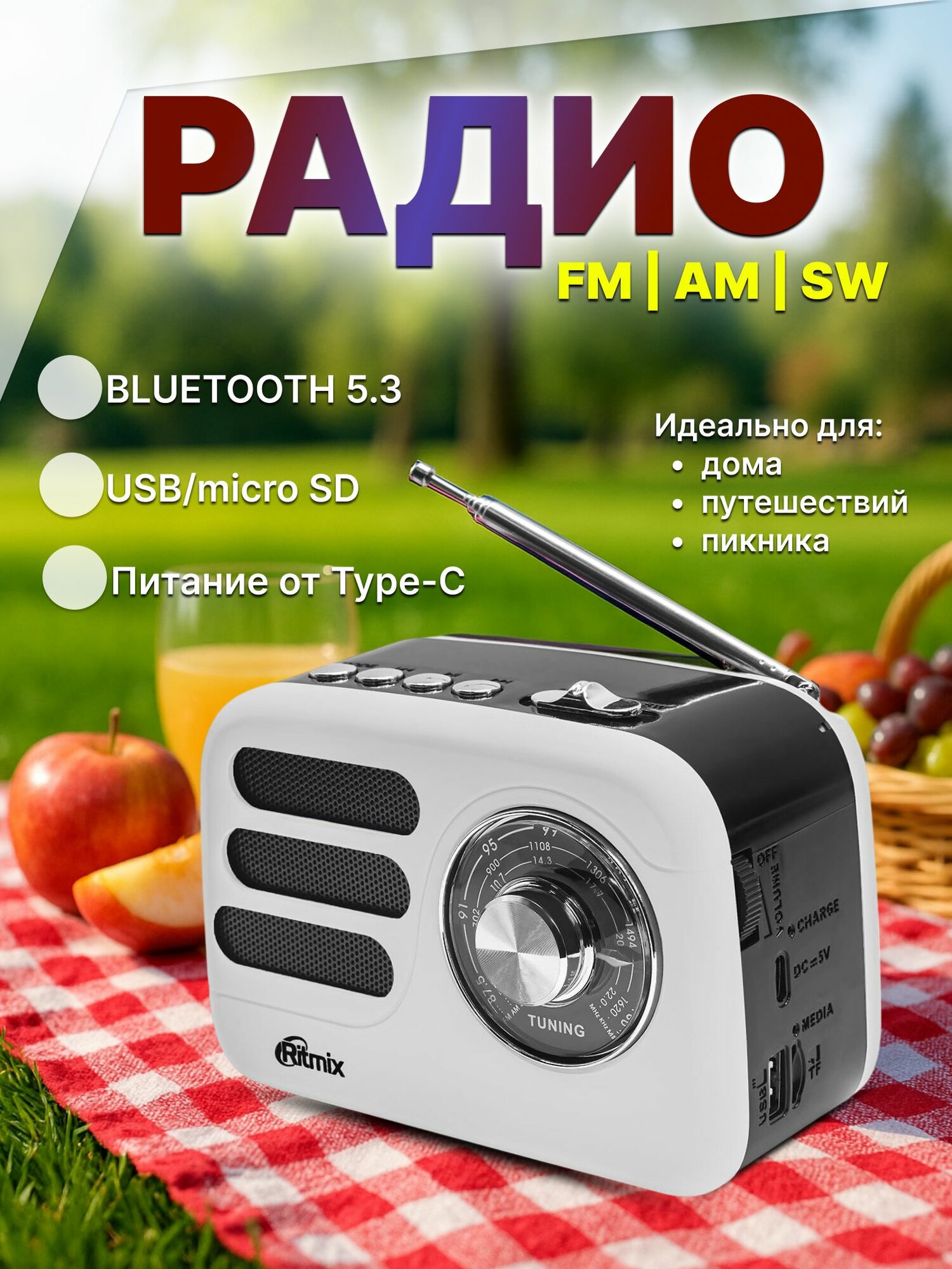 Портативный радиоприёмник Ritmix RPR-033: FM/AM/SW, Bluetooth, USB, аккумулятор, ретро стиль, цвет - белый интересное: