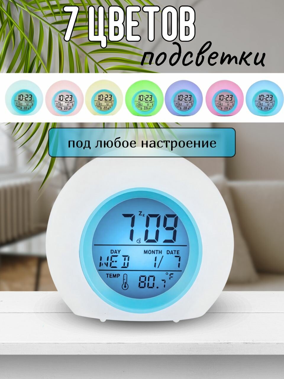 Будильник "Шар" со сменой цветов / Настольные музыкальные цифровые часы с разноцветной подсветкой синие интересное: