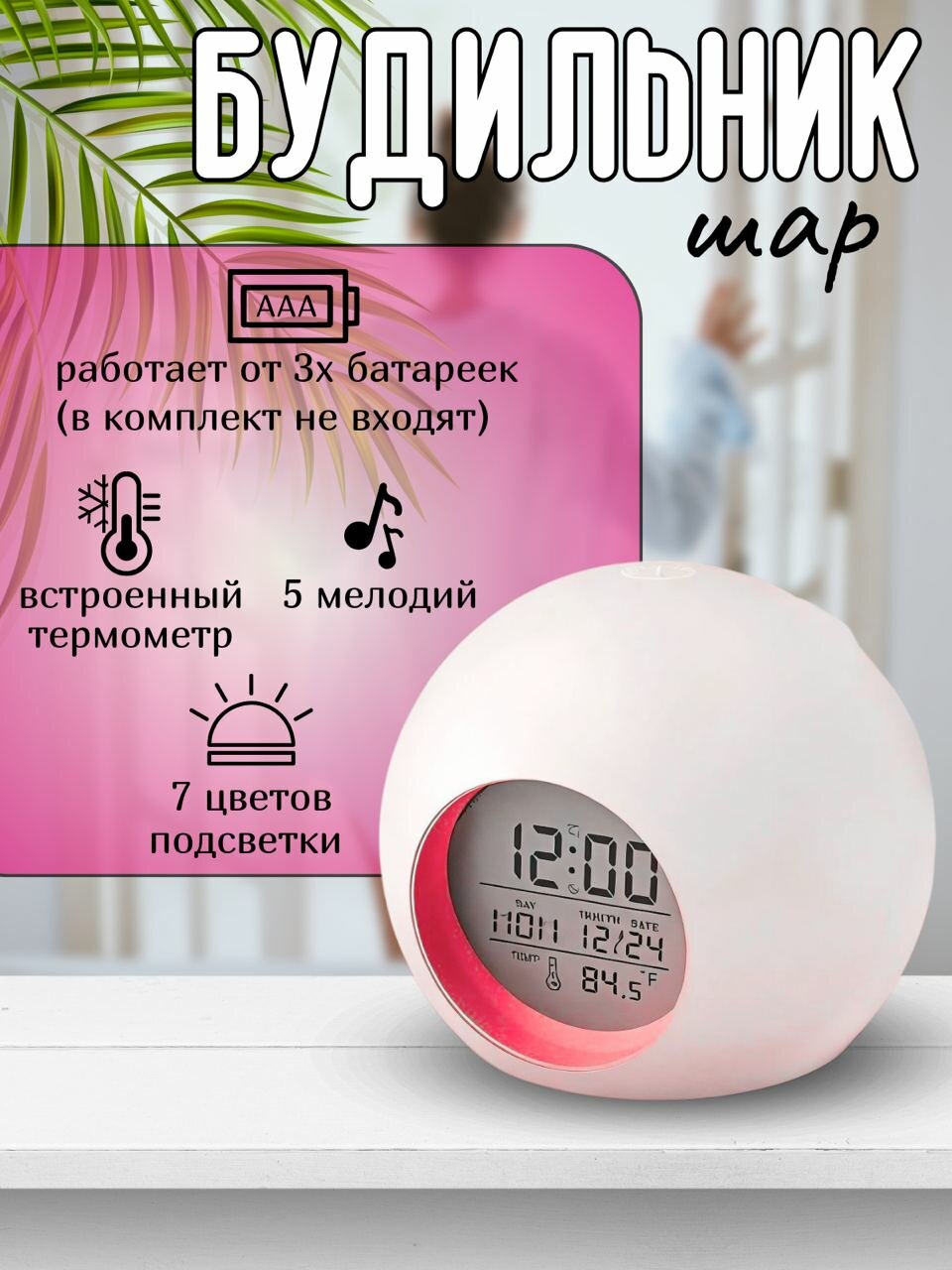 Будильник "Шар" со сменой цветов / Настольные музыкальные цифровые часы с разноцветной подсветкой красные интересное: