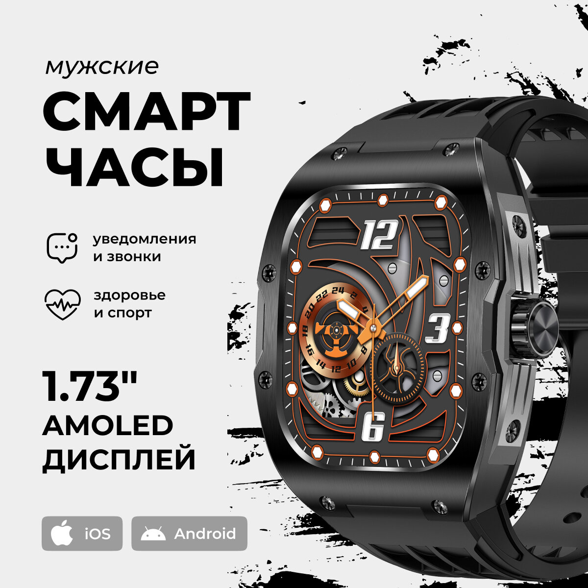 Смарт-часы умные наручные SMART PRESENT DA10 мужские, прямоугольные, с функцией телефона, с большим дисплеем, оранжевые