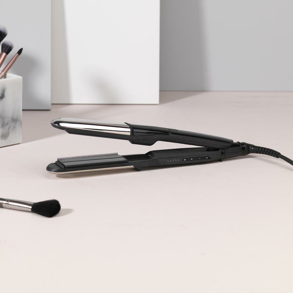 | Плюсы: | Есть функция пара, широкие пластины, можно использовать для завивки |