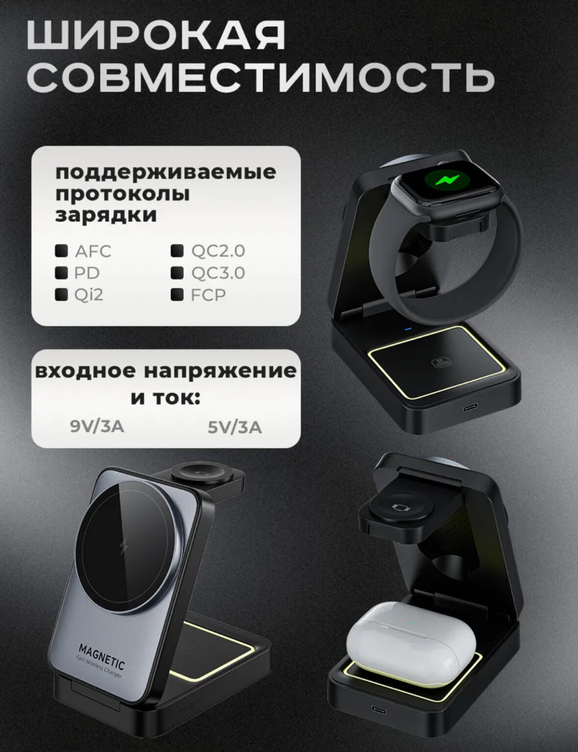 Беспроводная зарядка для iphone android, зарядная станция 3 в 1 для AirPods, Apple Watch, док станция для айфон magsafe интересное: