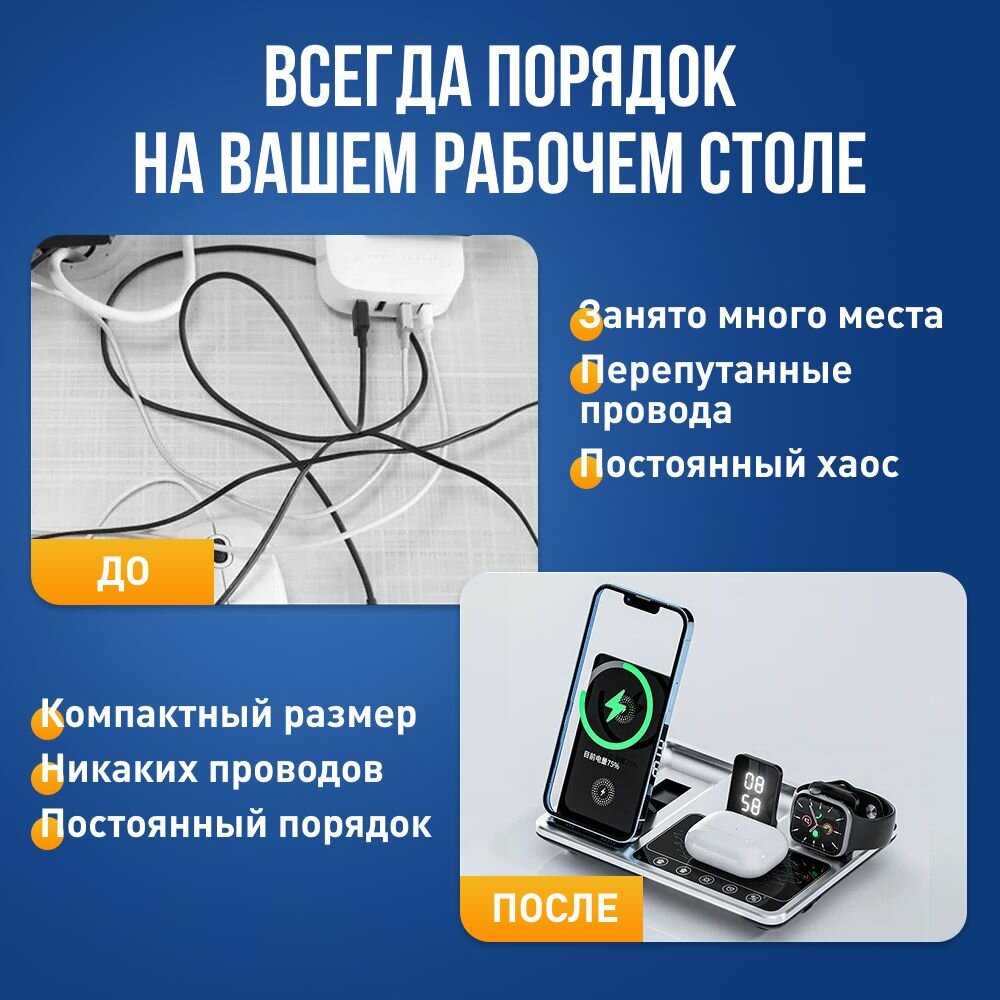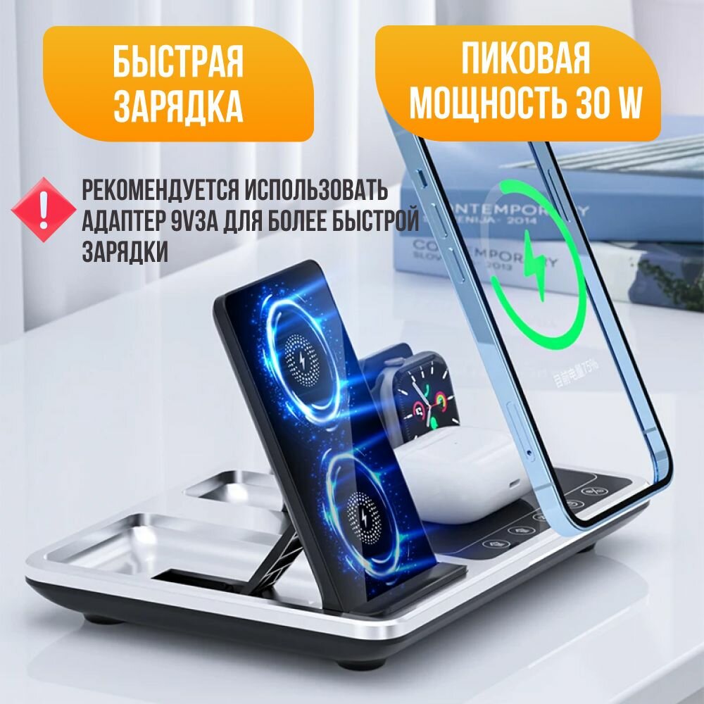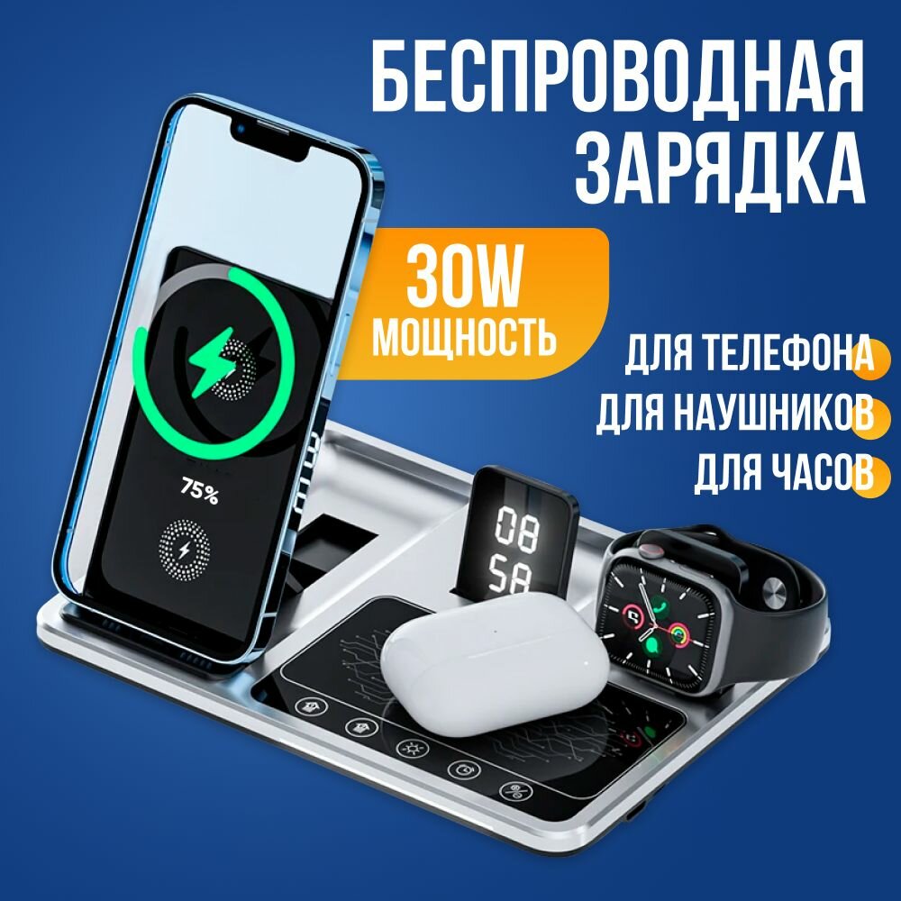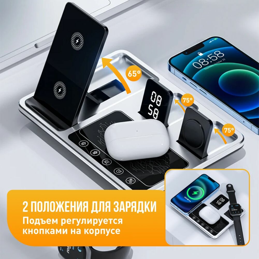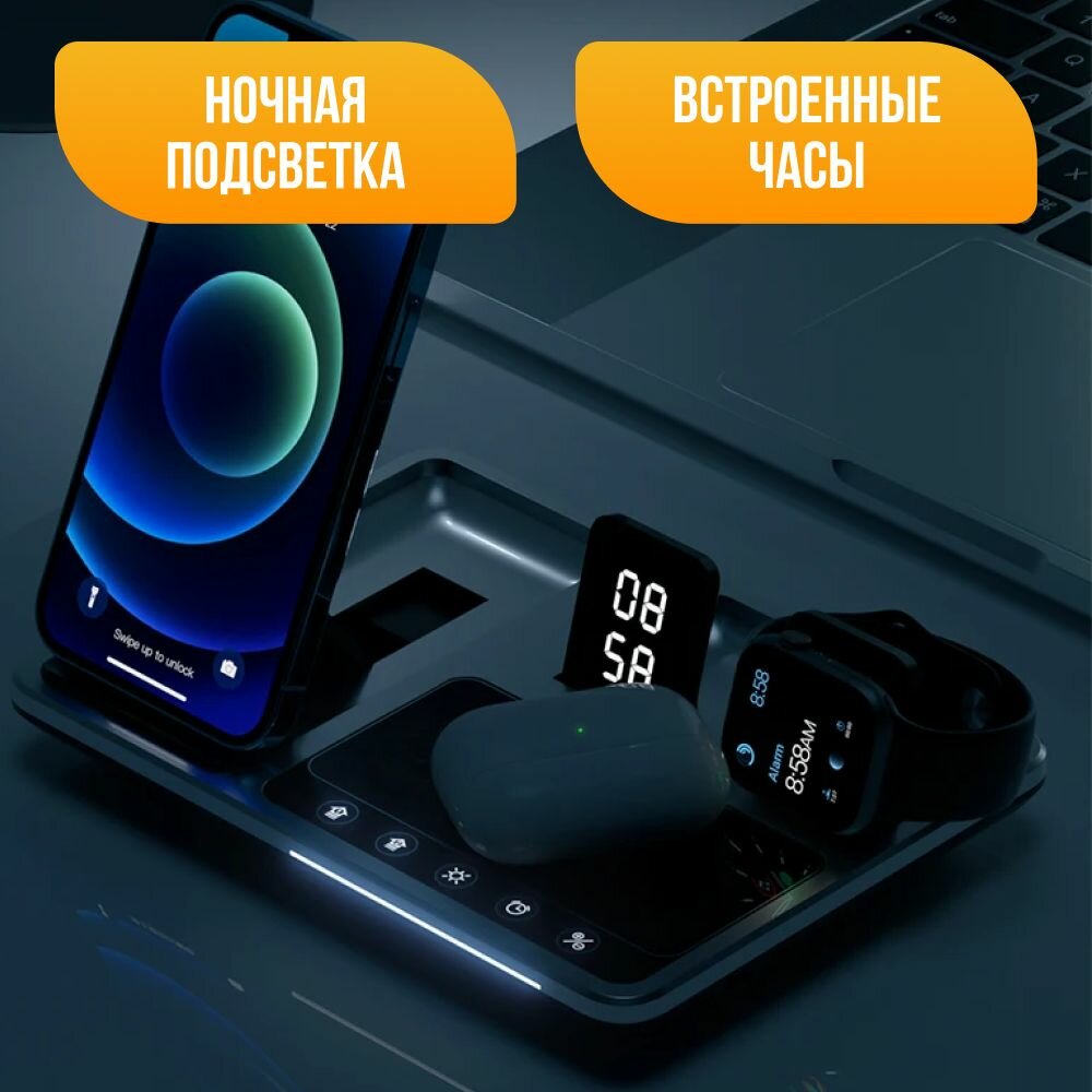 Купить Беспроводная зарядка R11 для Iphone и Android / Зарядная станция 3 в 1 со светодиодной подсветкой и часами