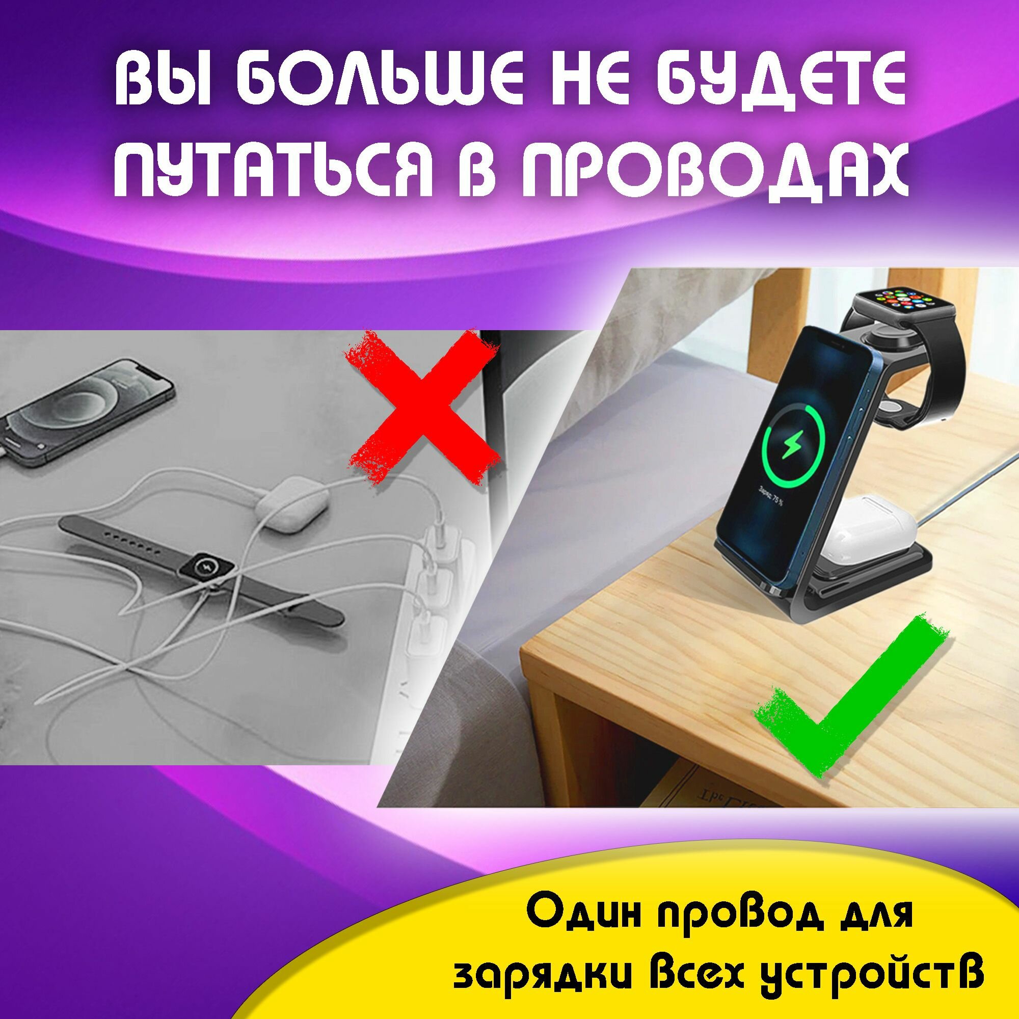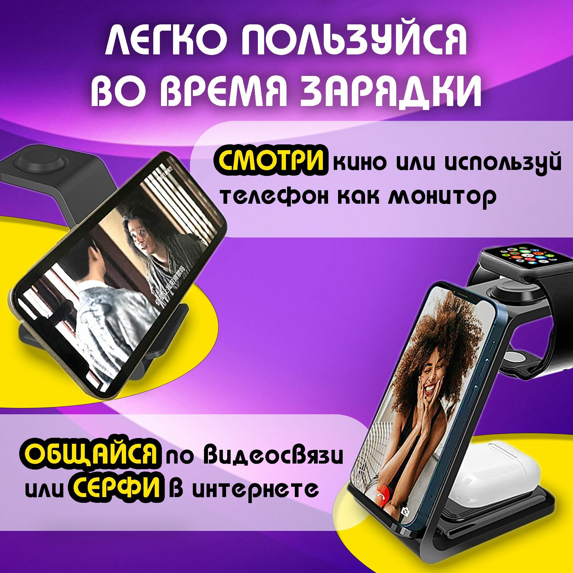 Беспроводная зарядка 3 в 1 / Док станция мощностью 15W с функцией быстрой зарядки Apple Iphone, Samsung, Xiaomi, часов Apple Watch и наушников AirPods / черная интересное: