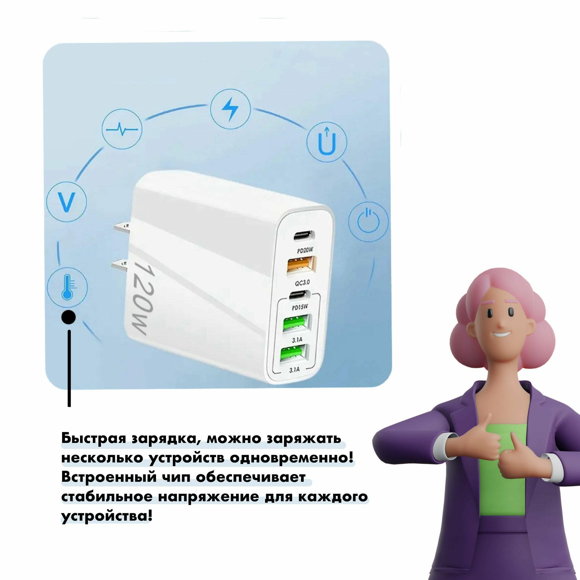 Зарядное устройство (адаптер) для зарядки телефона, планшета. 3 USB порта и 2 Type-C разъема 120W 5V 6.6А / белый цвет
