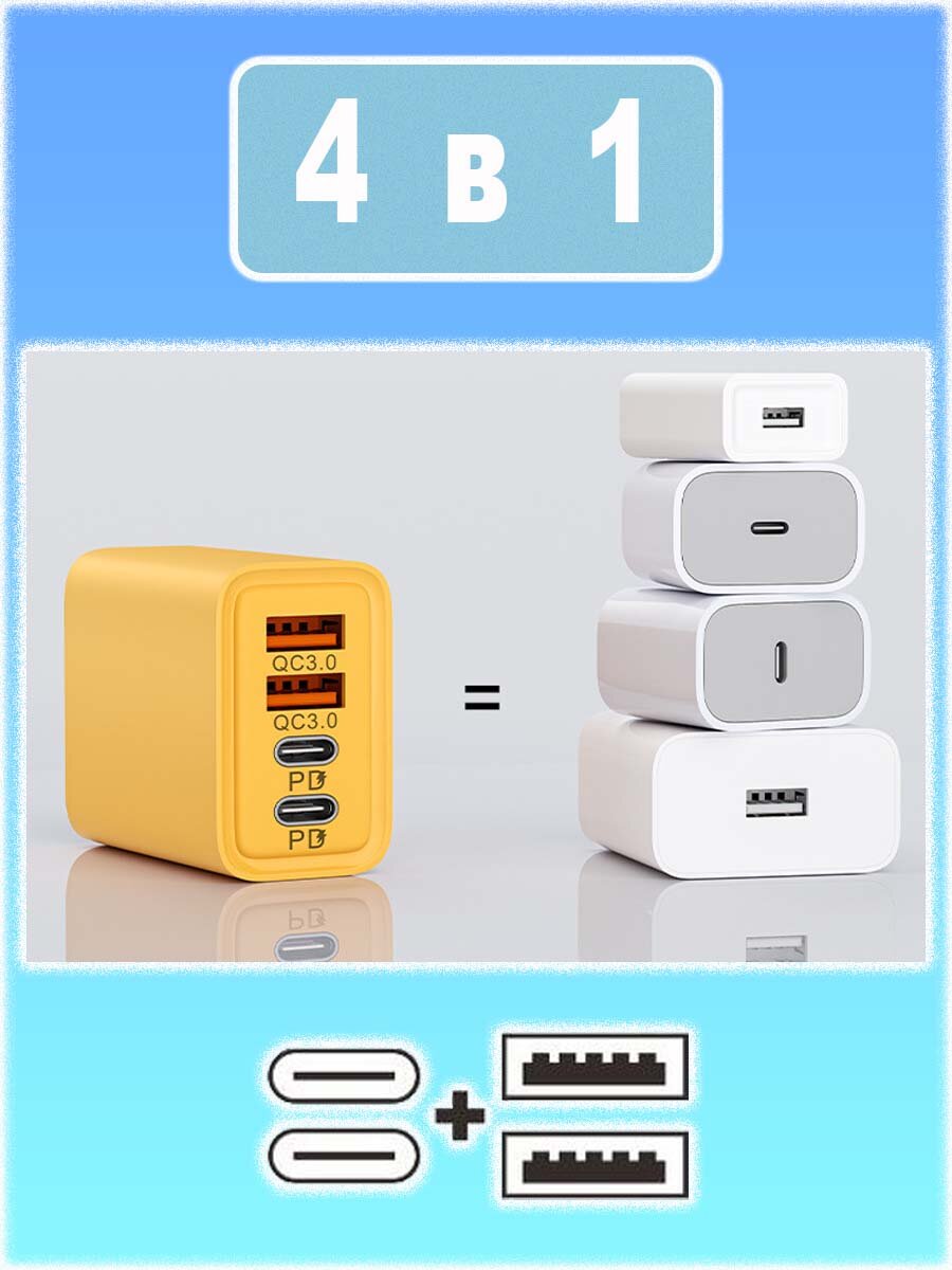 Быстрая зарядка для смартфонов Android/iOS; разъёмы 2USB+2PD, 120W; желтый