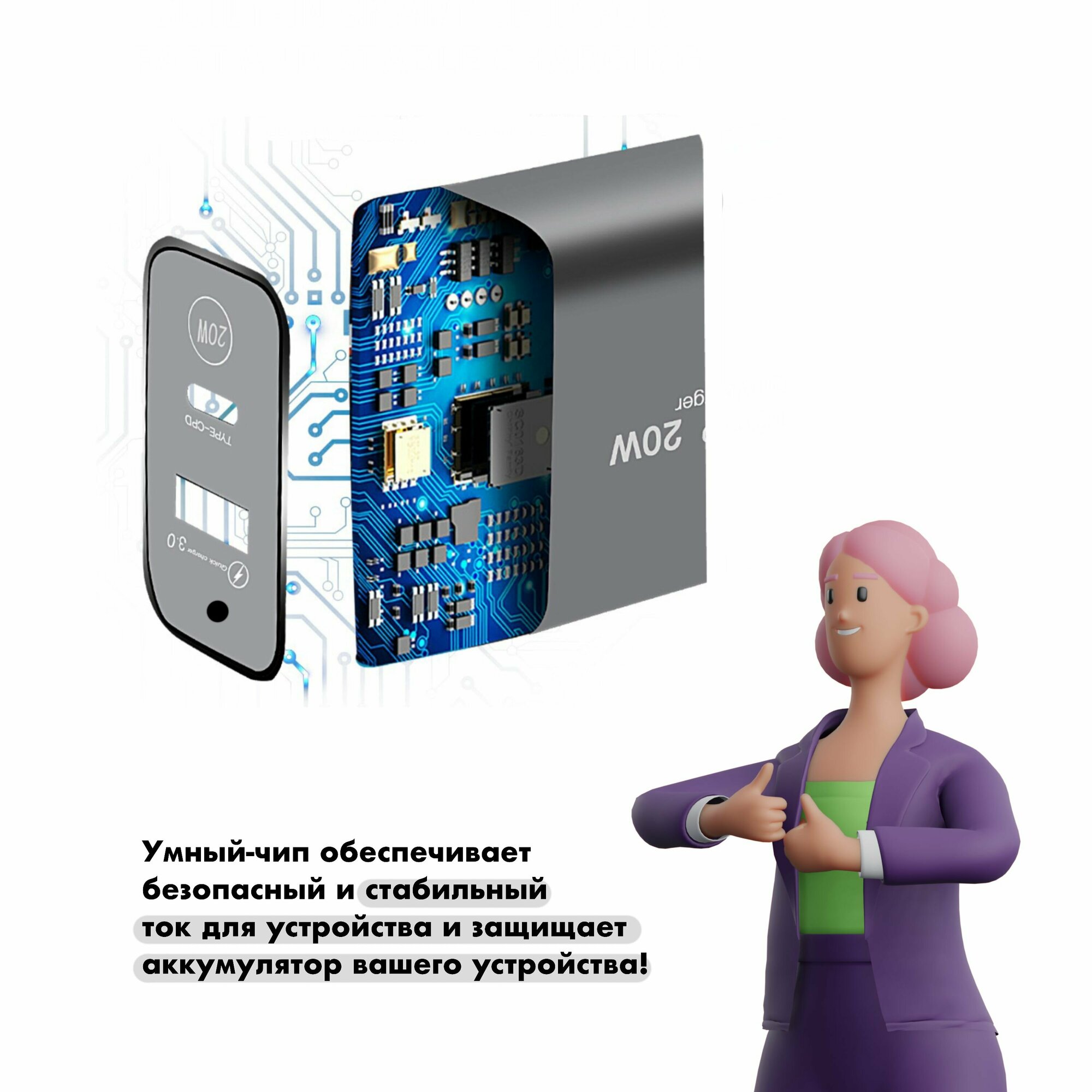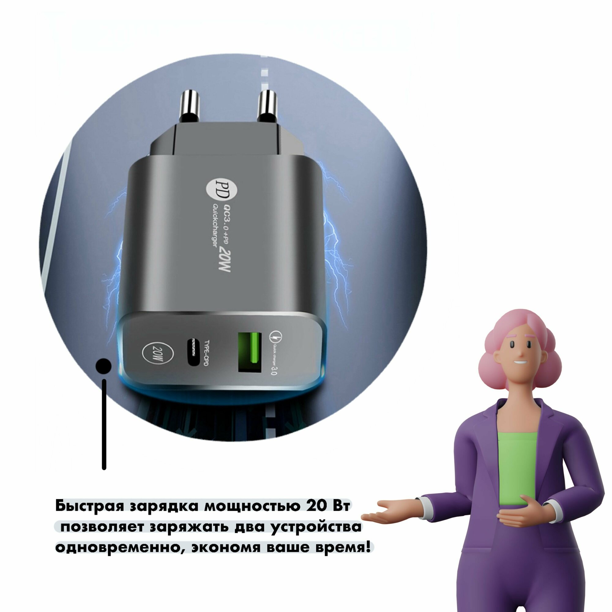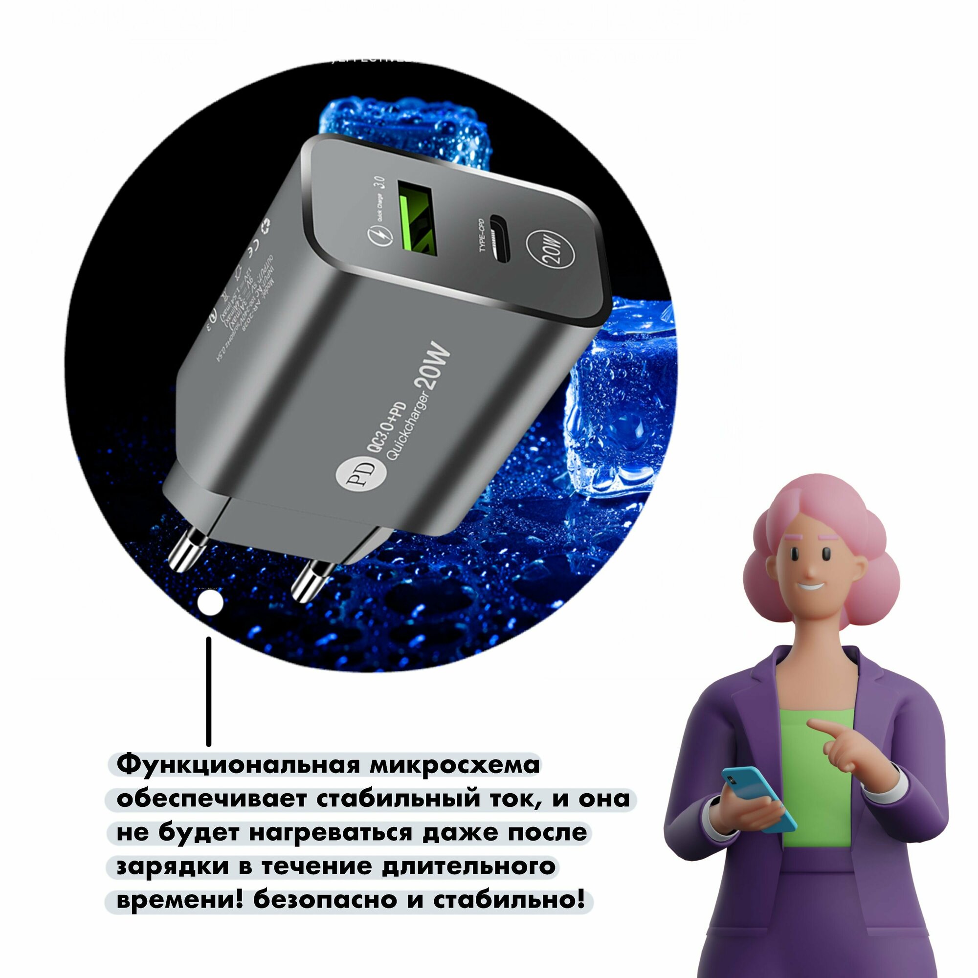 Зарядное устройство (адаптер) для телефона, планшета. 1 USB порт и 1 Type-C разъем 20W 5V 2.4A. интересное:
