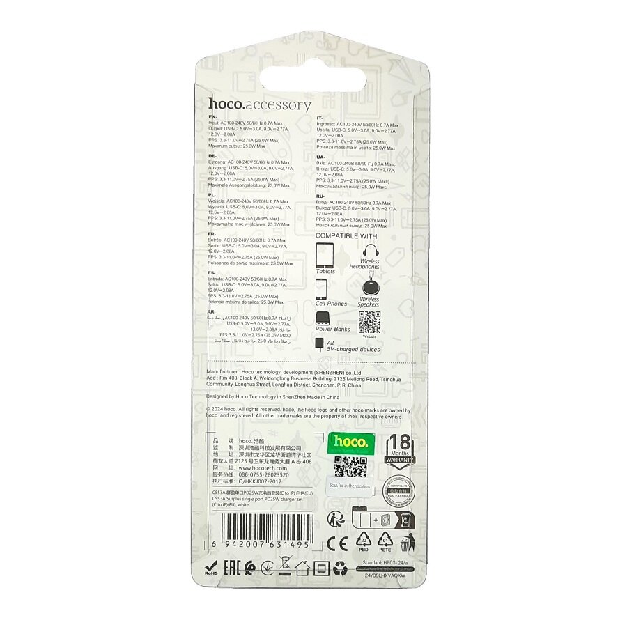 Сетевое зарядное устройство Hoco CS53A 25W с кабелем Type-C to iP, белый интересное: