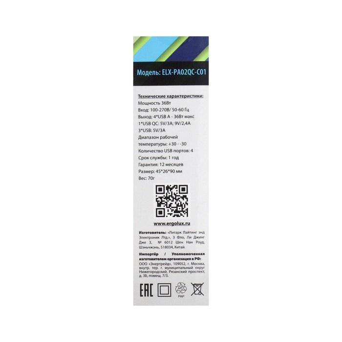 Блок питания, сетевое зарядное устройство 18W ERGOLUX USB 3 QC + Type C