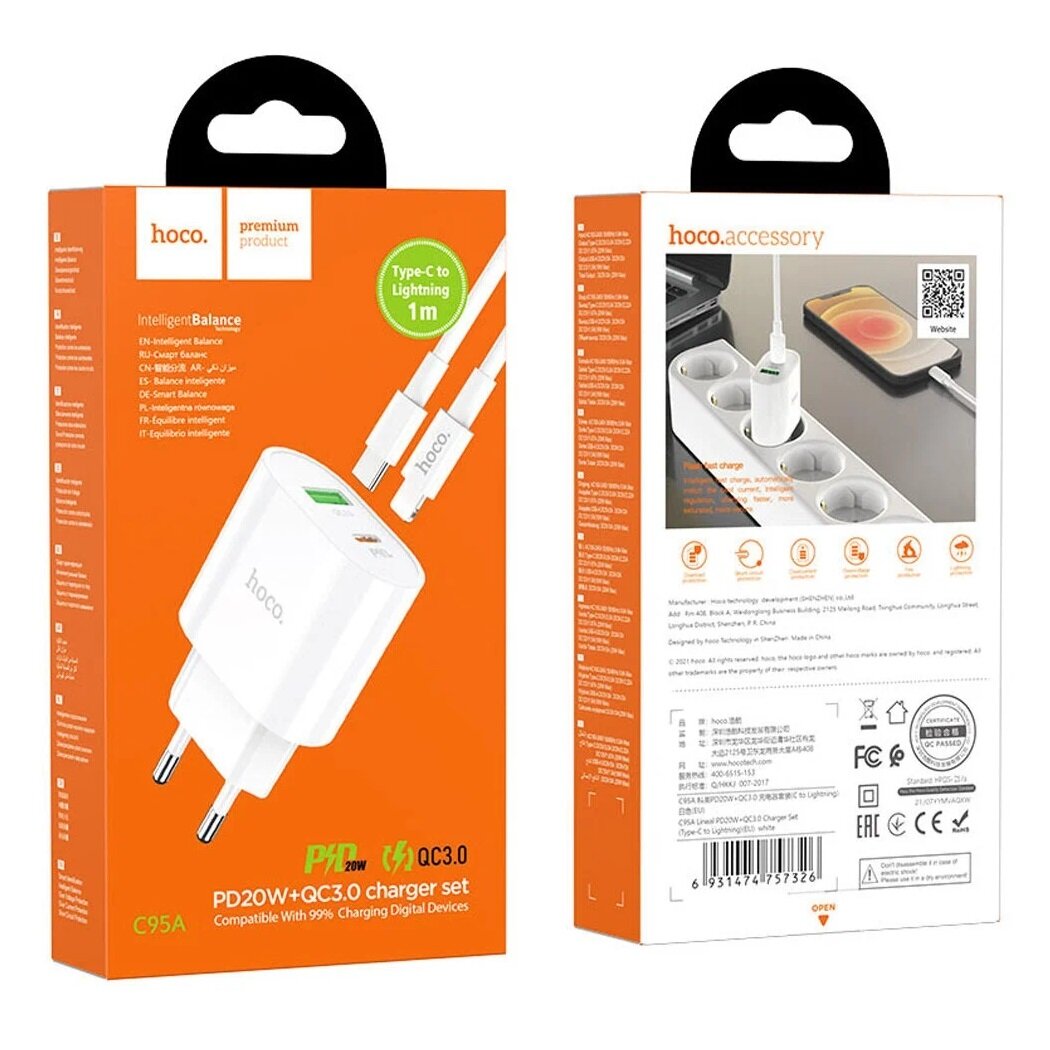 Купить Сетевое зарядное устройство для быстрой зарядки Hoco C95A, PD20W/QC3.0, USB3.0/Type-C, кабель Type-C to Lightning, белый