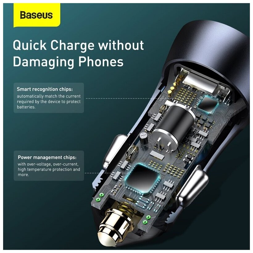 Автомобильное зарядное устройство BASEUS Grain Pro Smart Chip Protection, 2xUSB, 24W/4.8A, Черный