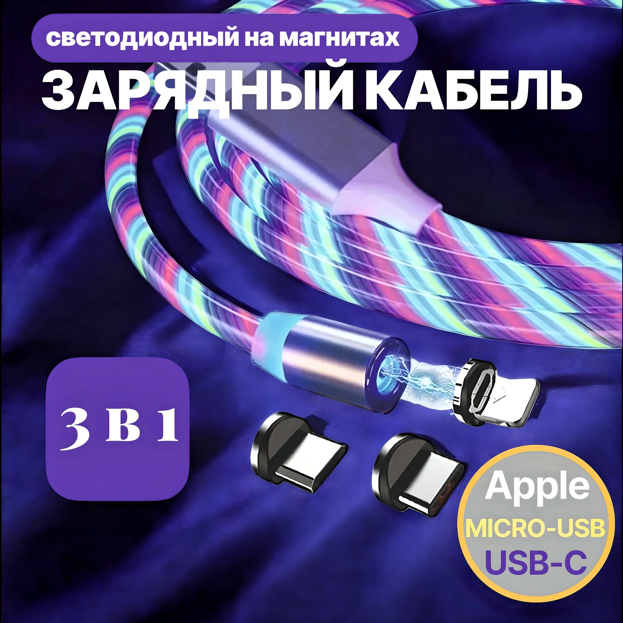 Кабель для мобильных устройств 3 в 1 с магнитным разъёмом, светодиодный, белый интересное: