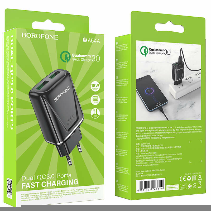 Купить Сетевое зарядное устройство Borofone Ba54a, 2xUSB, Qc3.0, 3 А, чёрное Borofone 9088819