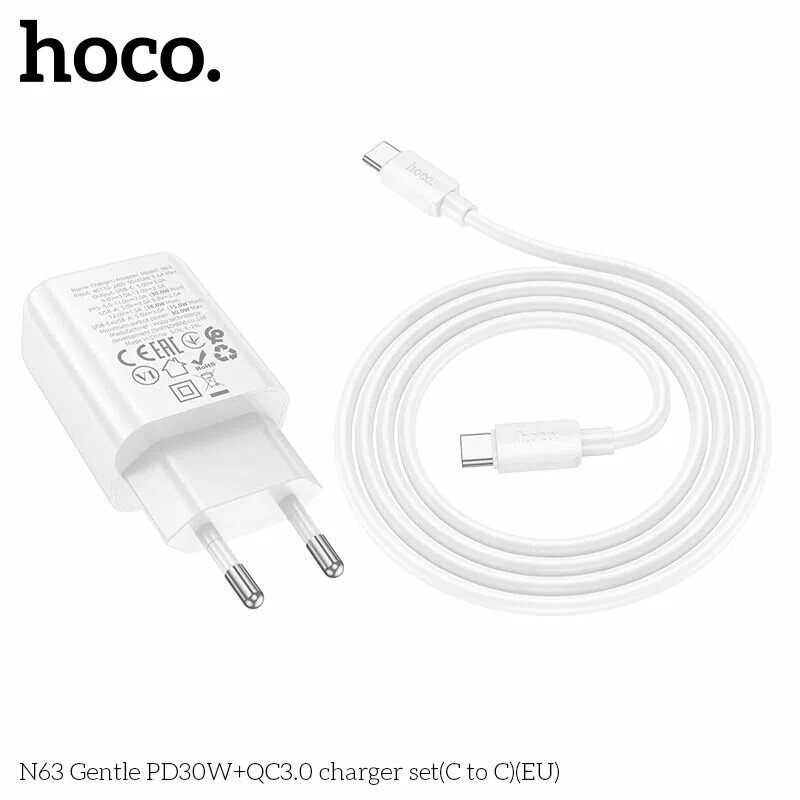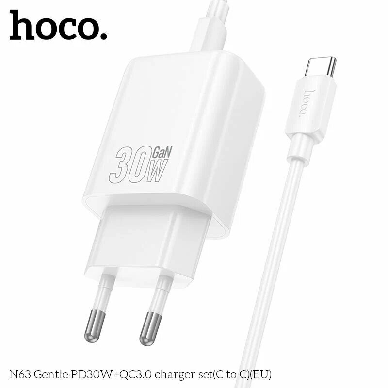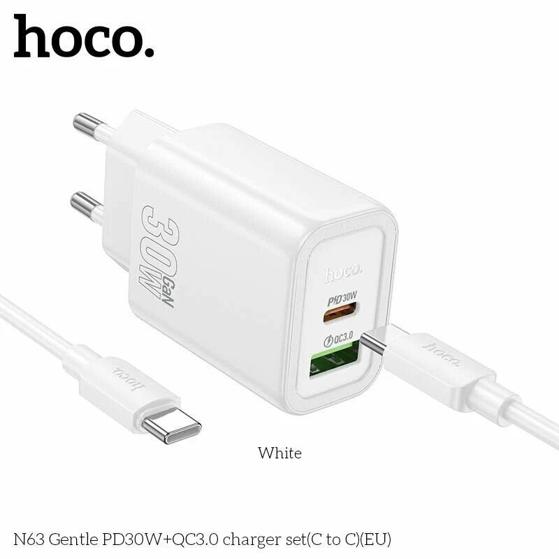 Купить Сетевое зарядное устройство Hoco N63 PD30W+QC3.0 с кабелем Type-C to Type-C, GaN, белый