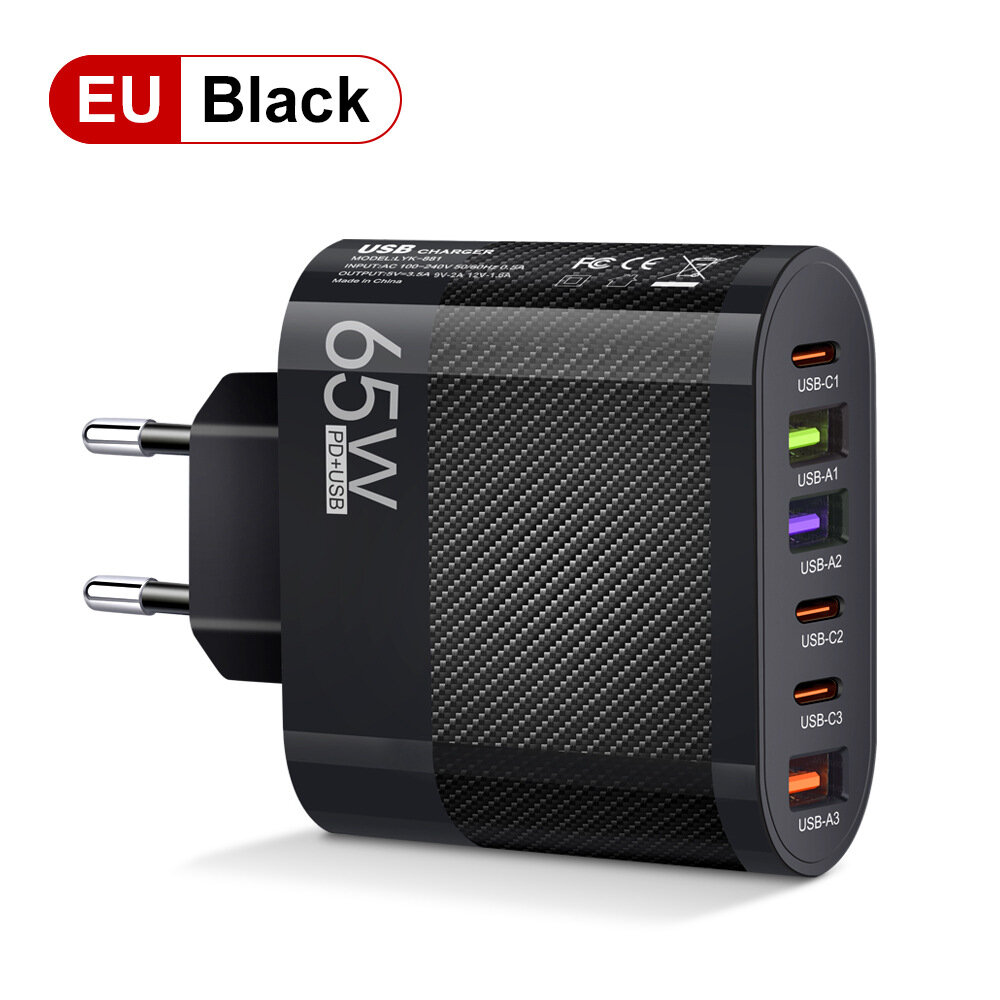 Купить Зарядное устройство, 65Вт, 3USB+3Type-C, мультиинтерфейс, европейское, черное