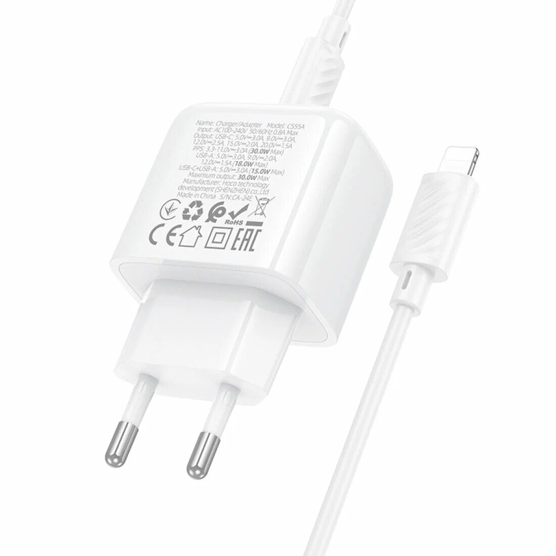 Купить Сетевое зарядное устройство Hoco CS55A PD30W/QC3.0, GaN, с кабелем Type-C to Lightning, белый