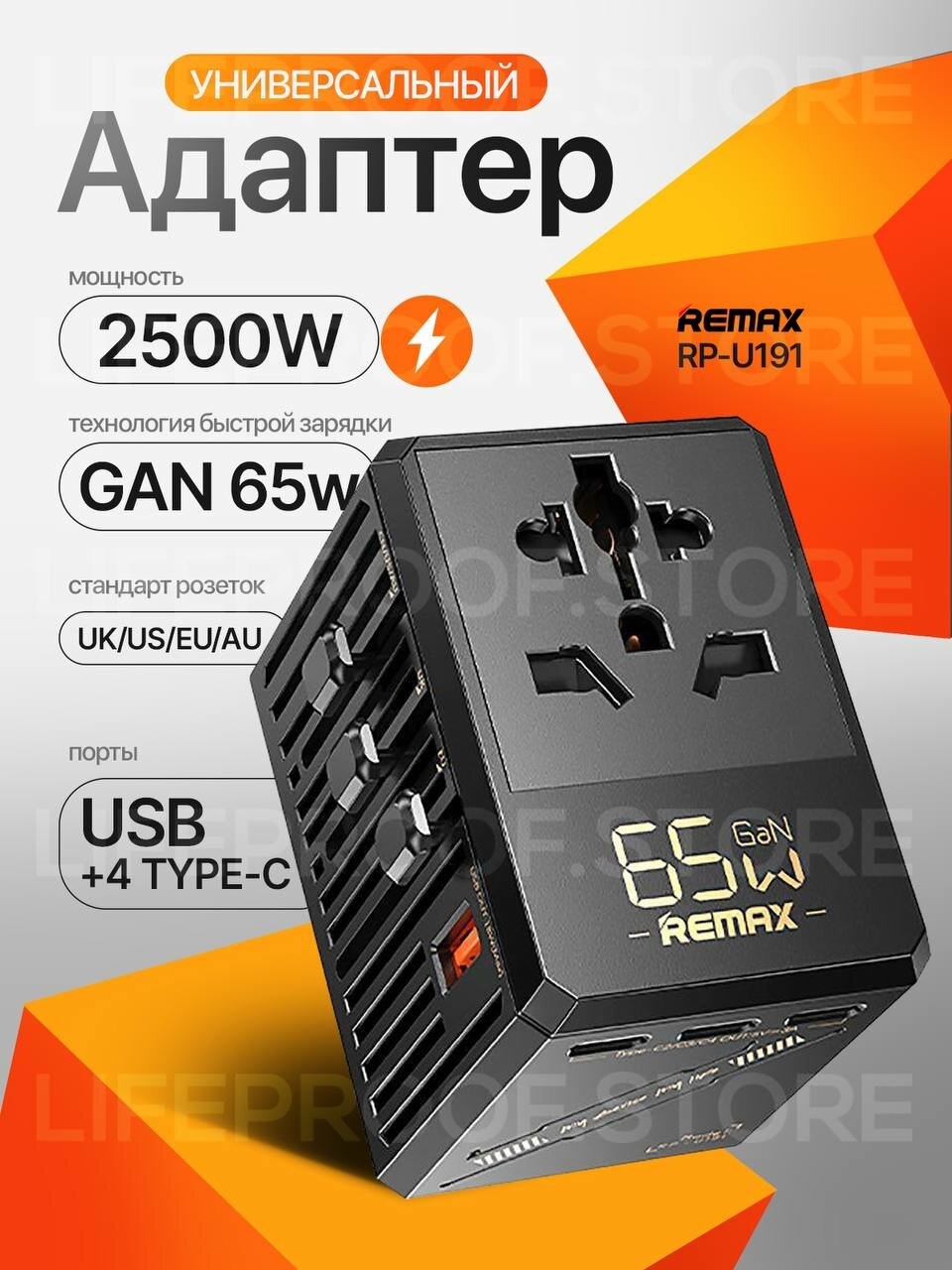 Универсальный адаптер Remax RP-U191 на все виды розеток 2500W, зарядное устройство USB + 4 Type-C GaN 65W, цвет Черный интересное: