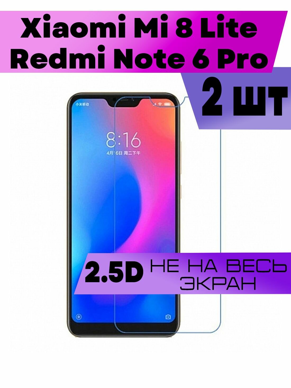 Комплект 2шт, Защитное стекло 2D для Xiaomi Mi 8 Lite, Redmi Note 6 Pro, Сяоми Ми 8 Лайт, Нот 6 Про (не на весь экран, без рамки) интересное: