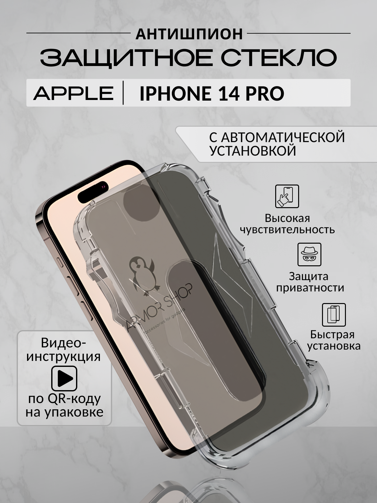 Защитное стекло с "автоматической" установкой для iPhone 14 Pro, антишпион интересное: