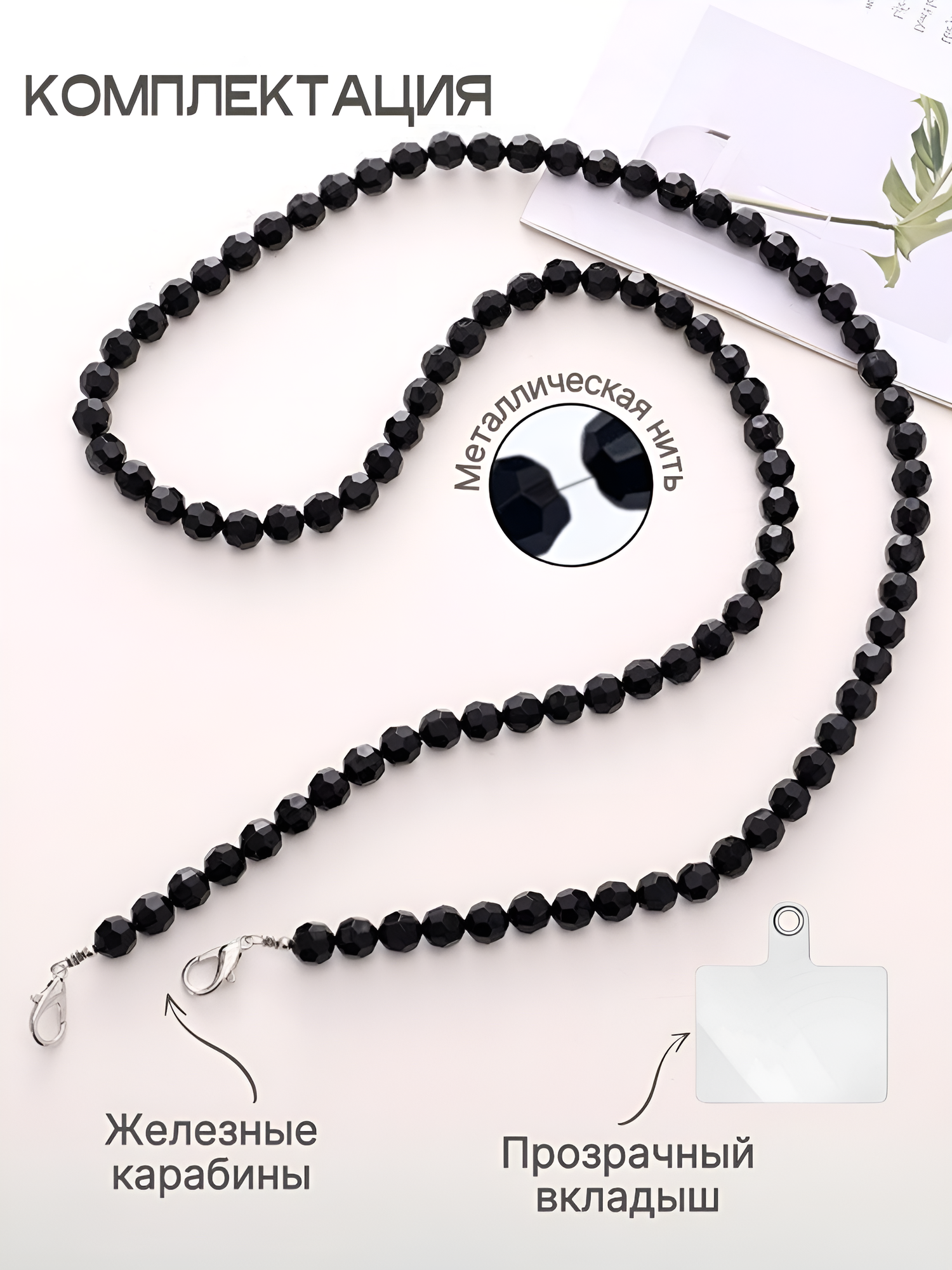 Купить Шнурок подвеска для телефона с черными бусинами и вкладышем для чехла