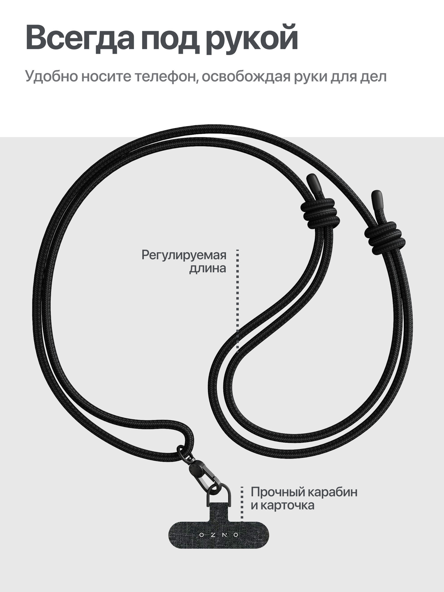 Купить Шнурок на шею для смартфона с металлическим карабином, 2020x6 мм, черный