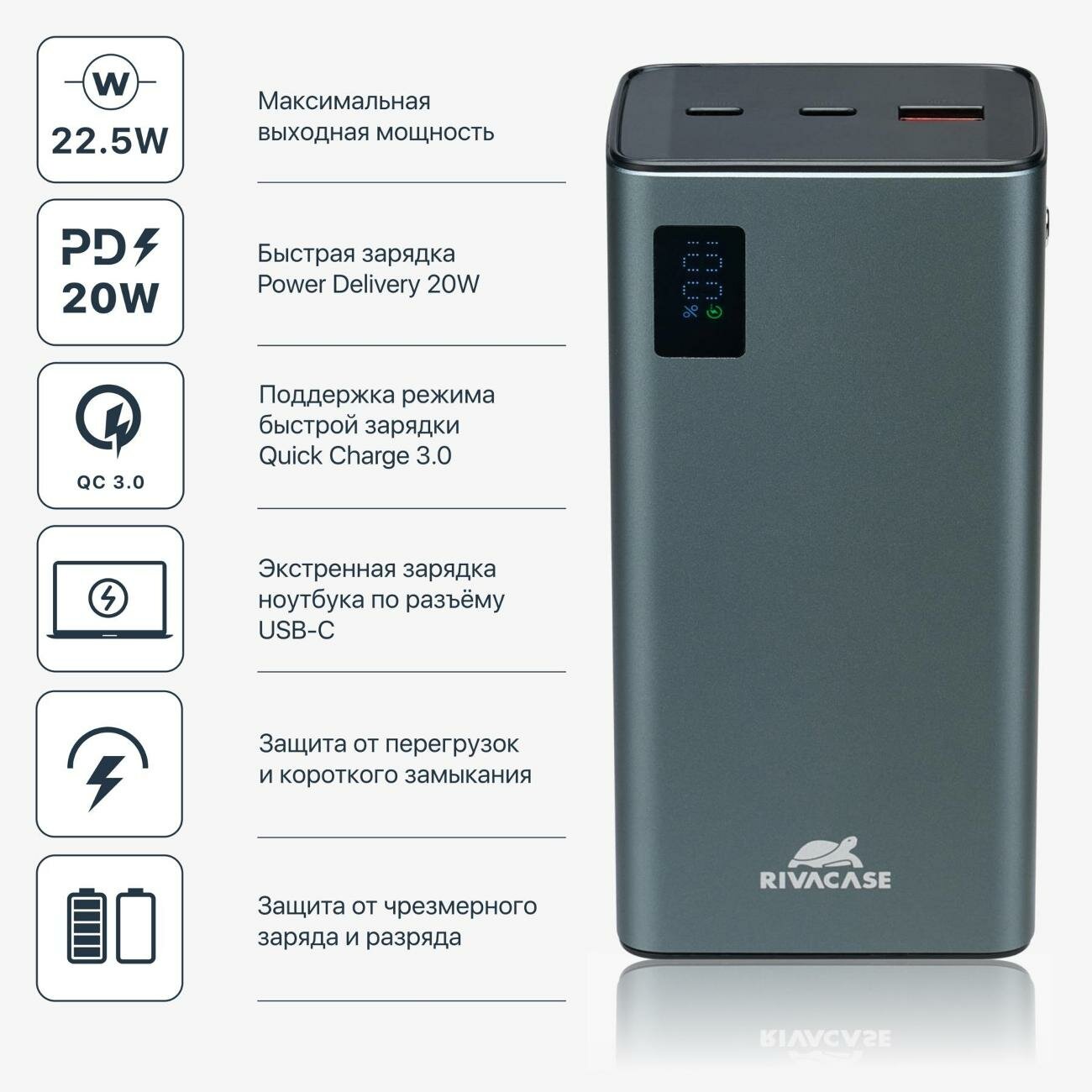 Внешний аккумулятор RIVACASE VA1023 30000 mAh RUS QC/PD металлический интересное: