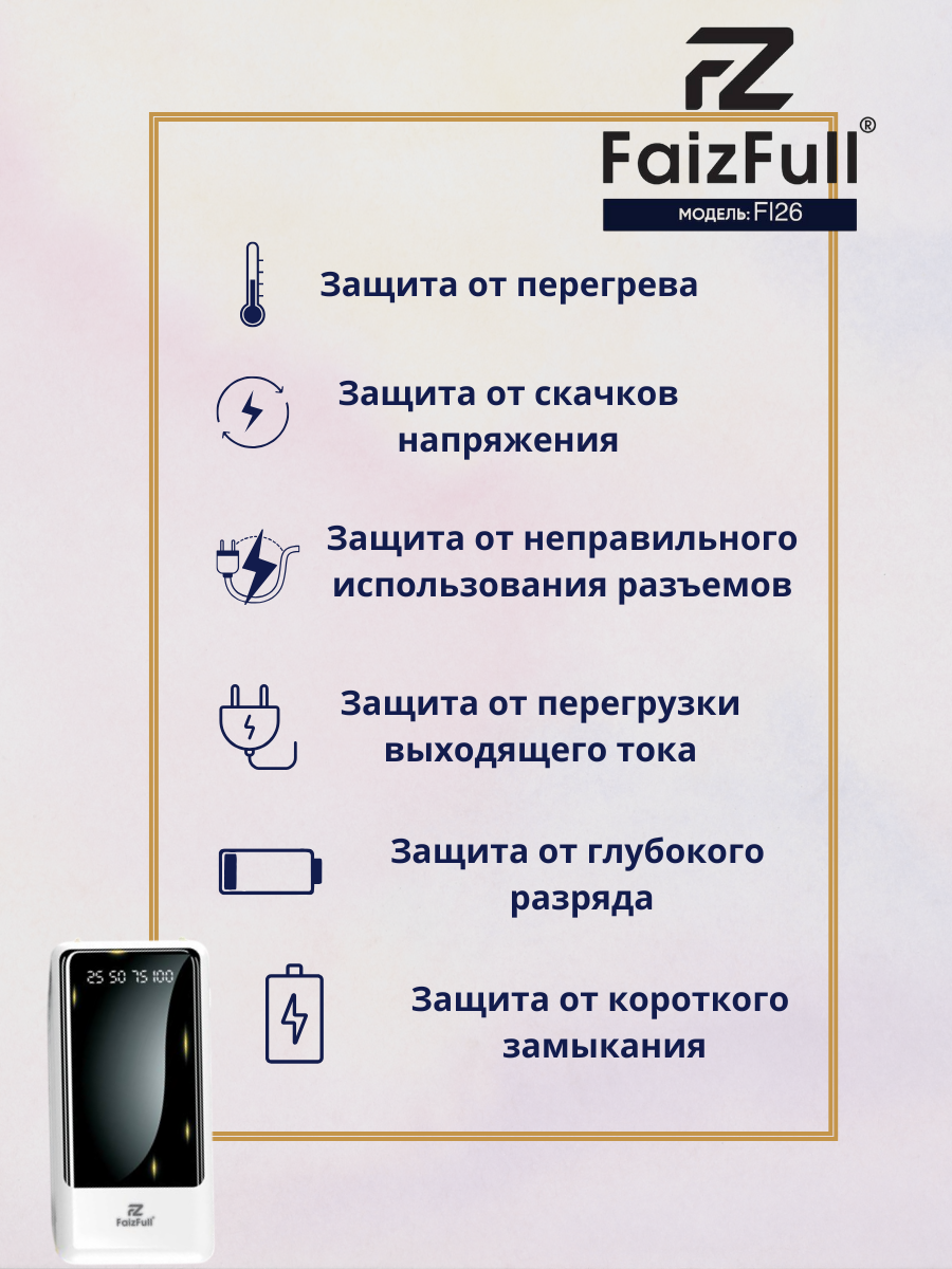 Power Bank, FaizFull, FL26, 20000 mah, Повербанк, встроенные провода, фонарик, черный