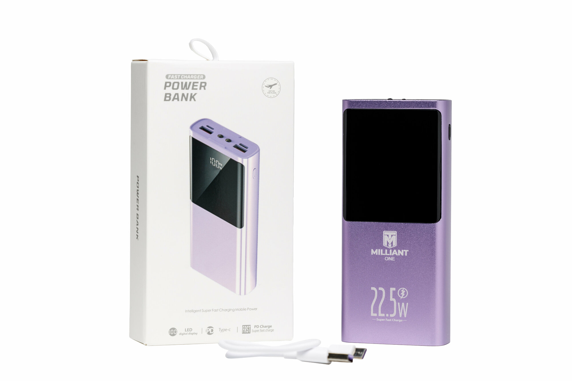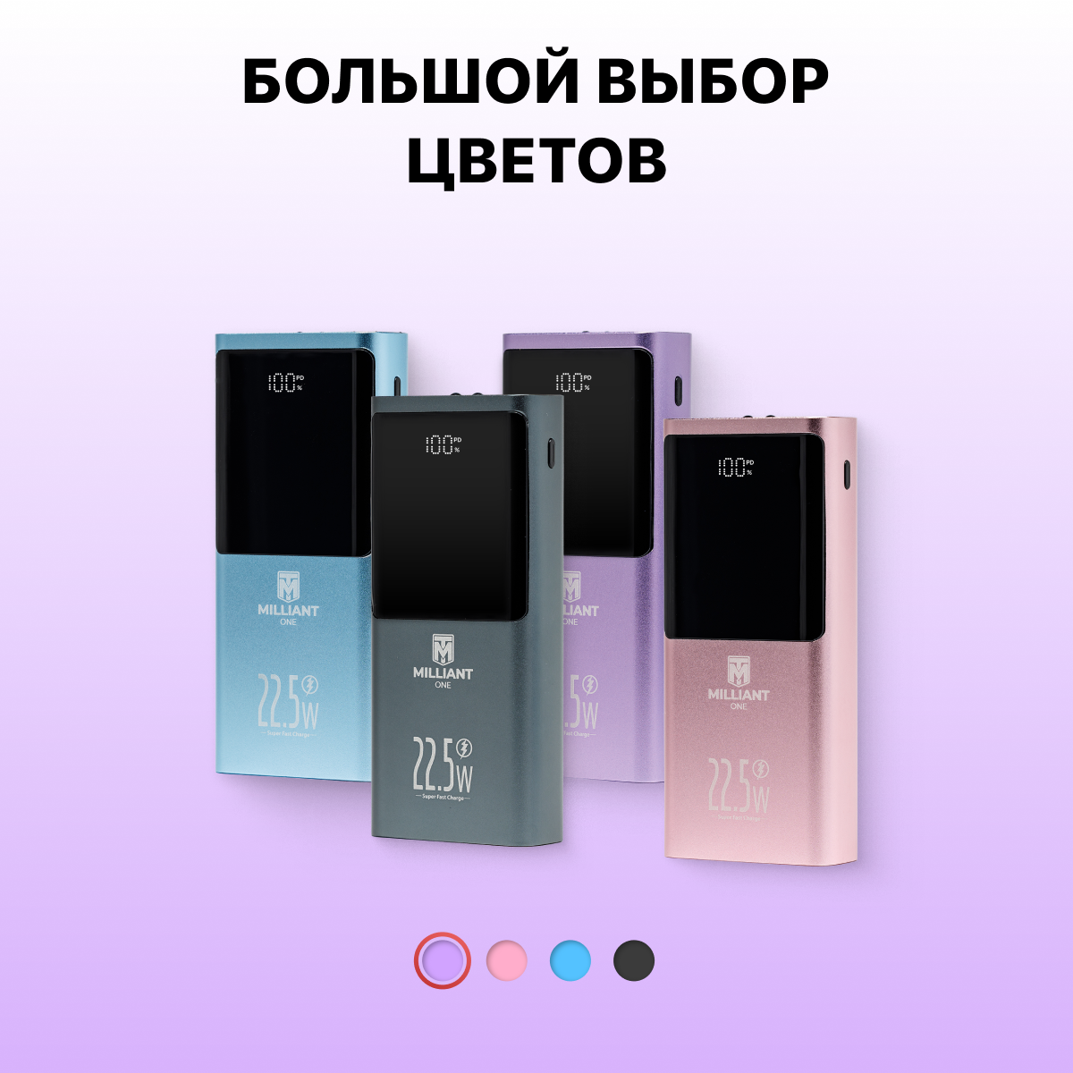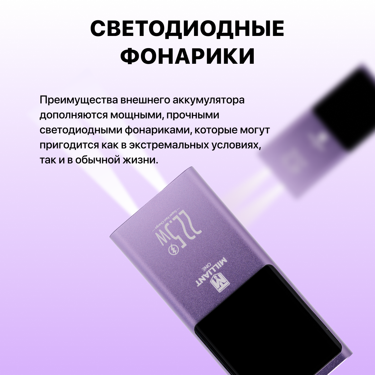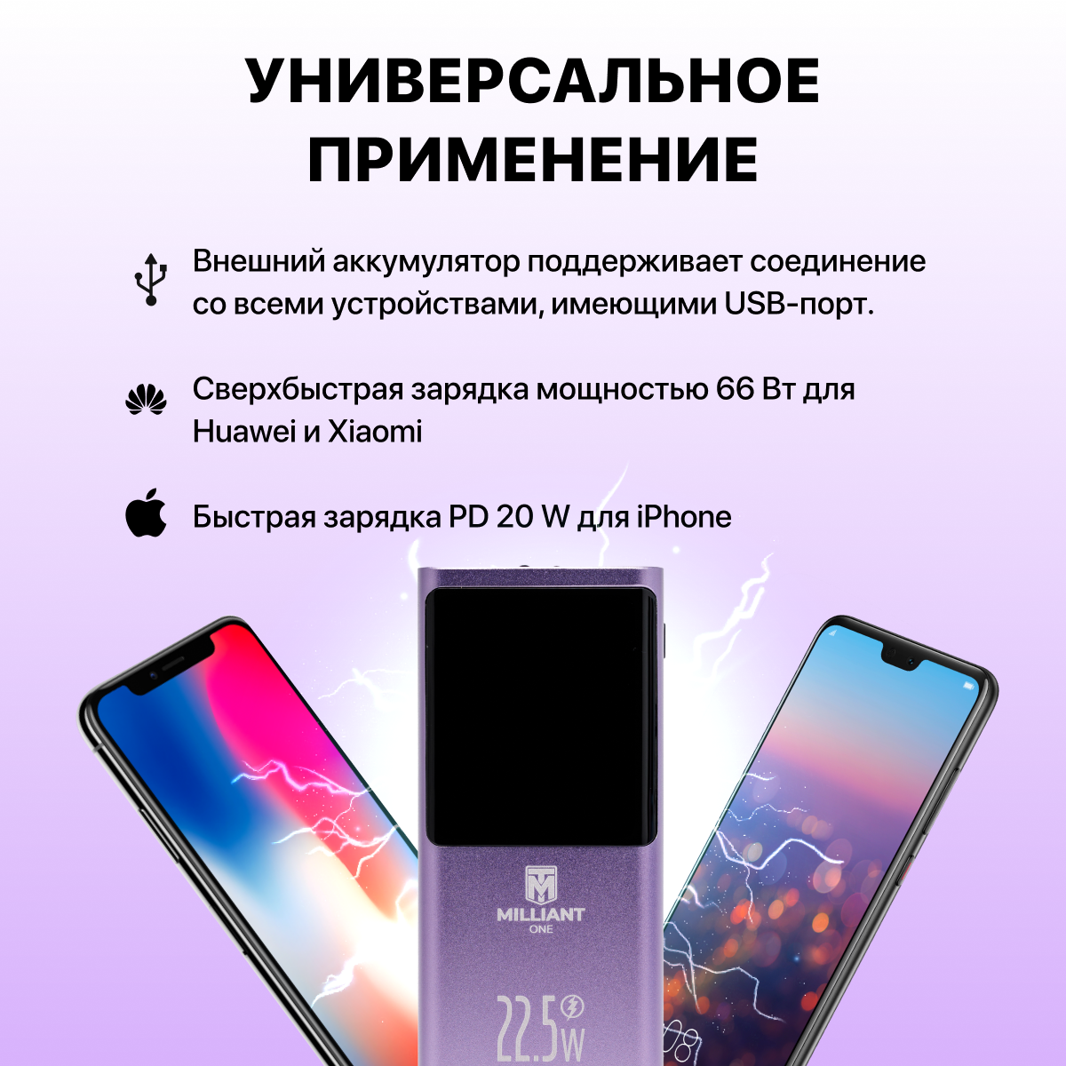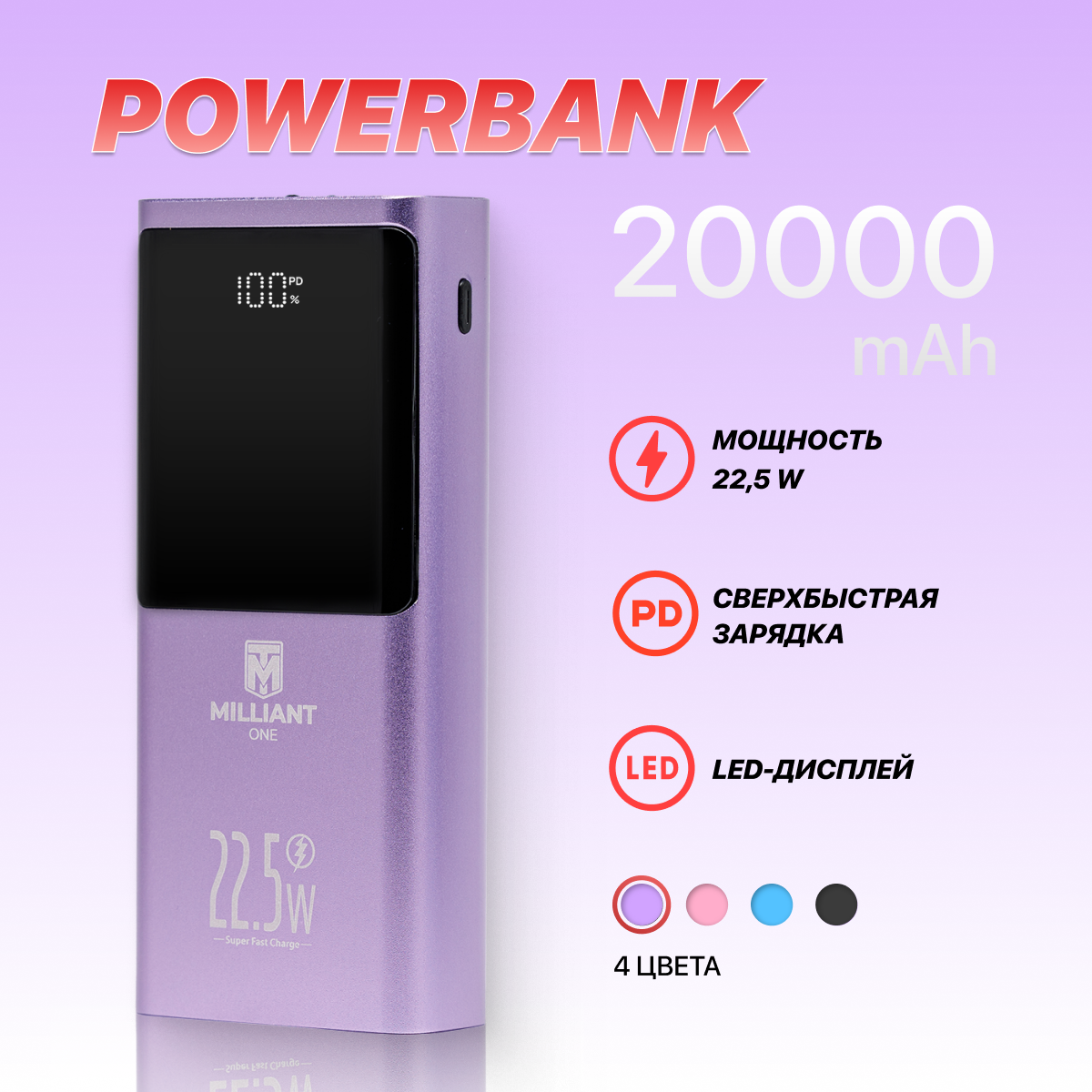 Power bank 20000 mAh / пауэрбанк / внешний аккумулятор 20000 mAh Milliant ONE PD 22.5W двусторонняя супер быстрая зарядка ( фиолетовый ) интересное: