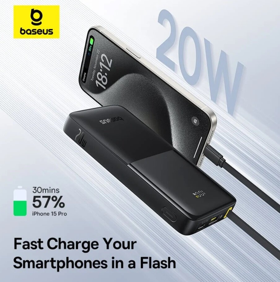 Внешний аккумулятор Baseus Bipow 2 Digital Display With USB-C Cable 20W 20000mAh Moon White