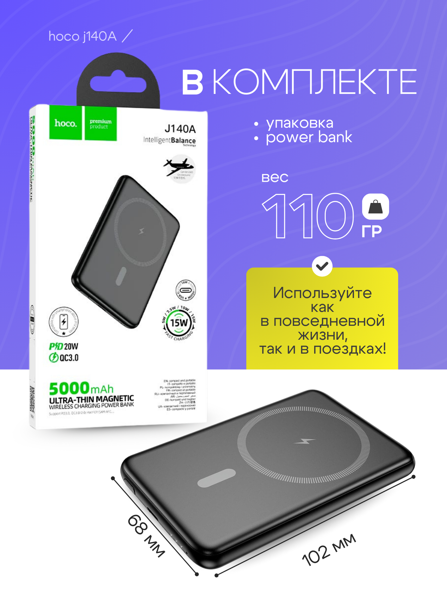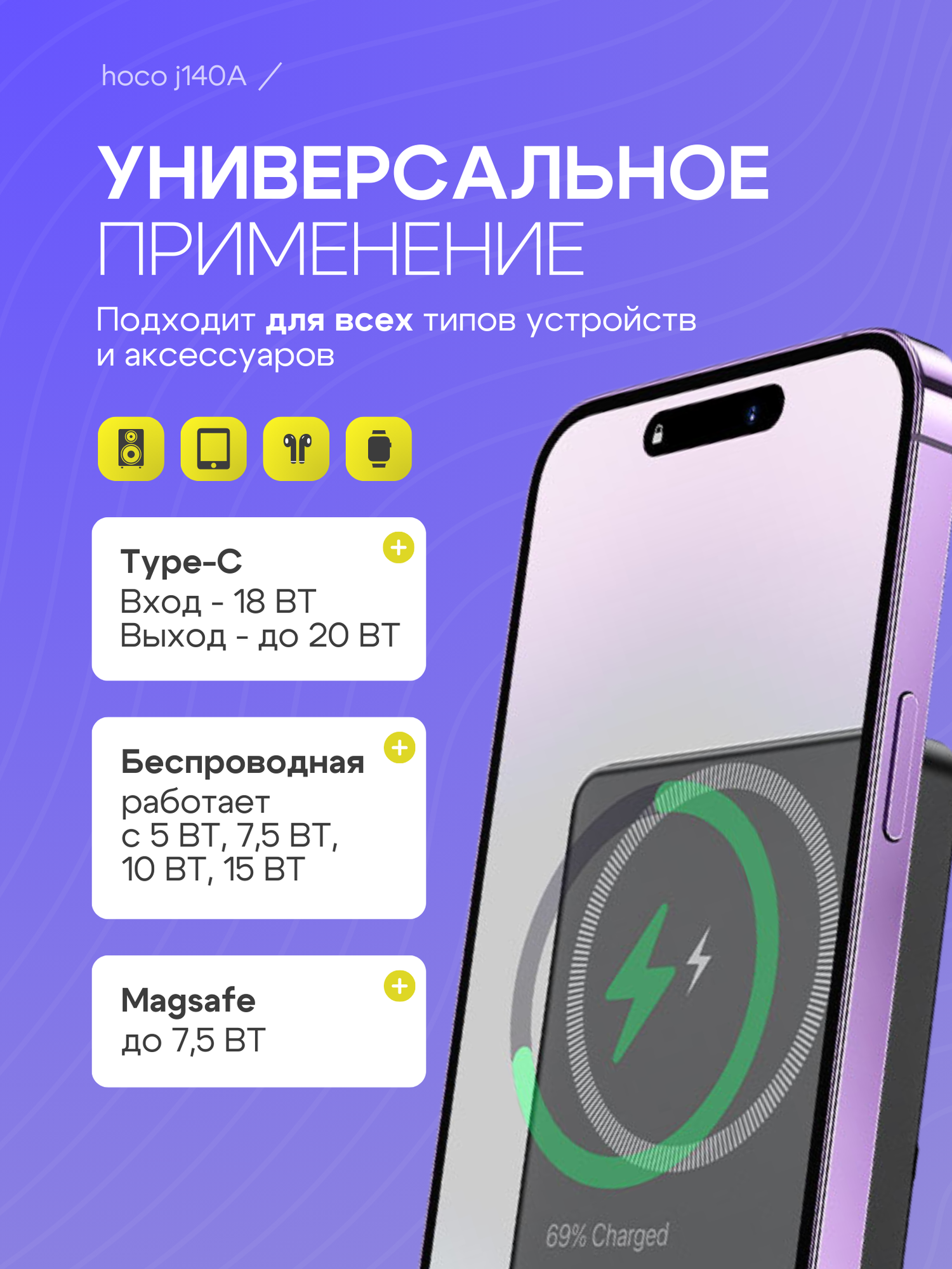 Внешний аккумулятор Hoco J140 5000mAh, магнитный, быстрая зарядка интересное: