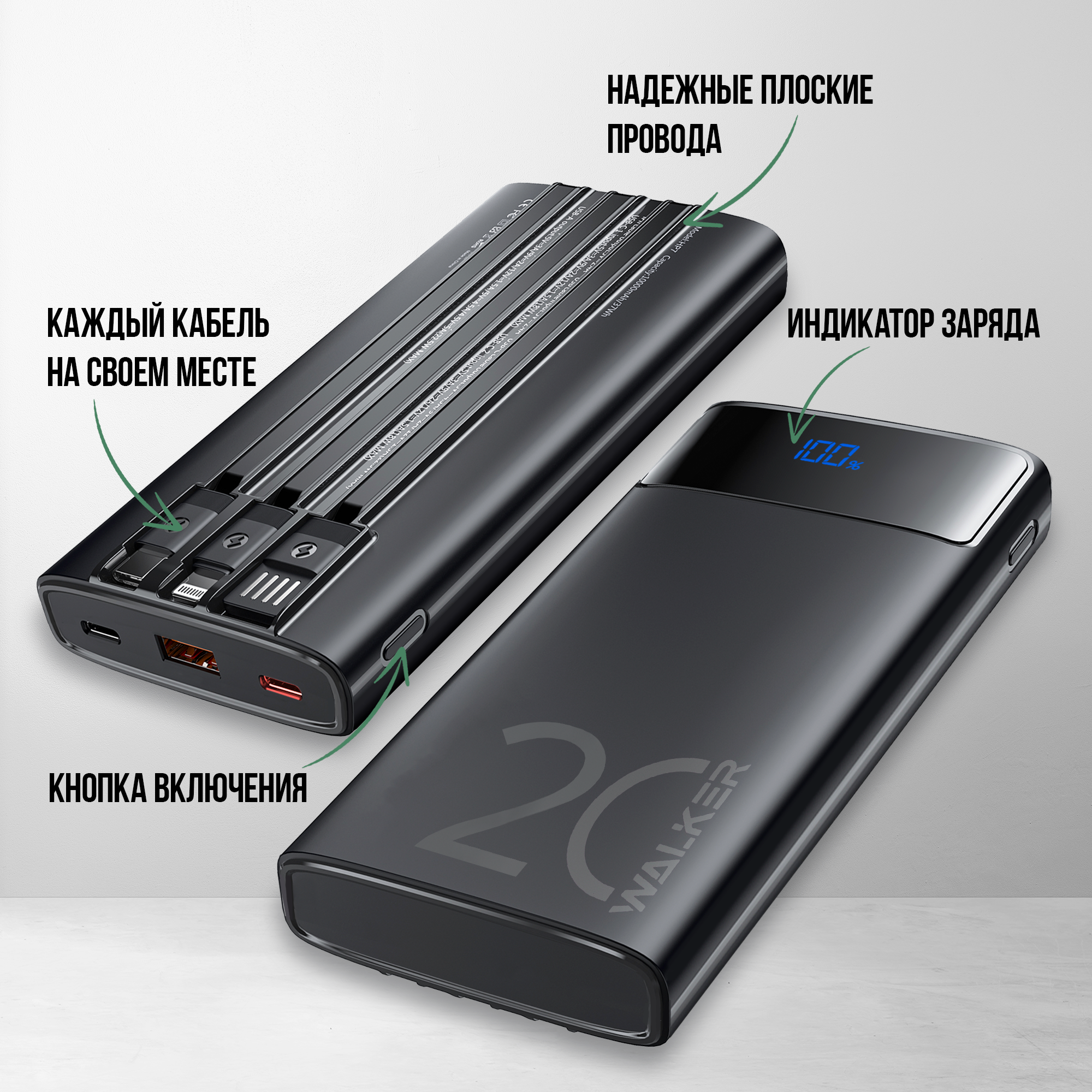 Повербанк WALKER, 10000 mAh, 3 встроенных кабеля, powerbank, пауэр банк, внешний аккумулятор, power bank, черный интересное:
