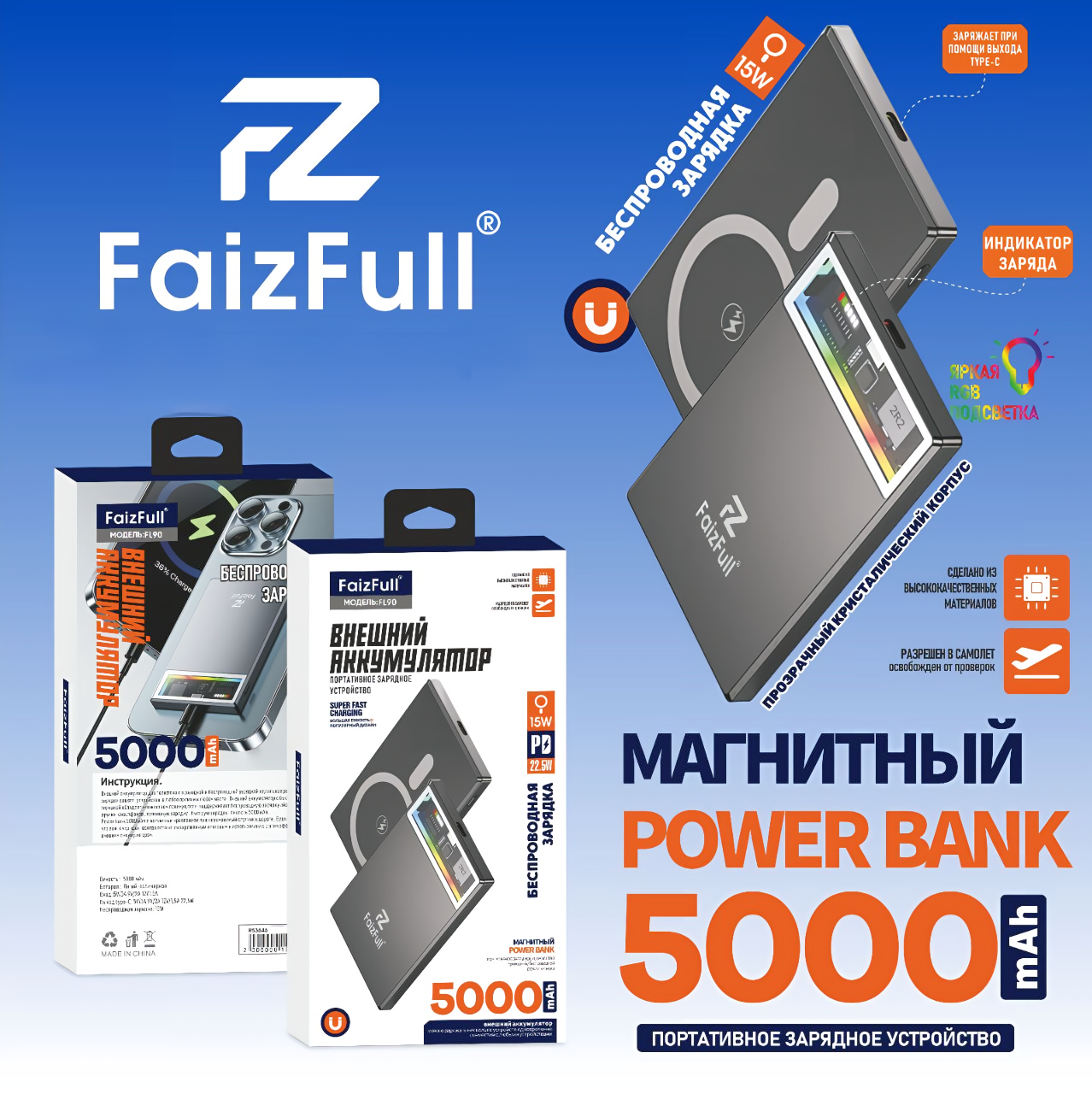 Магнитный Power Bank MagSafe 5000 mAh для iPhone 12/13/14/15/16 серии с быстрой зарядкой 22.5W интересное: